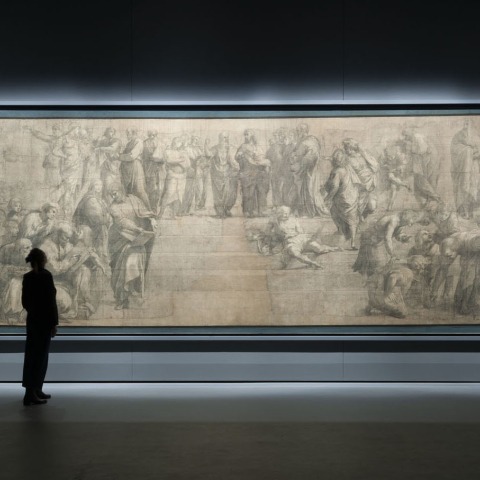 "Todas nuestras opciones de configuración, a partir de las próximas secuencias del gran Dibujo, están diseñadas para preparar al público para la visión de una obra que mantiene -intacta- en sí misma una maravillosa conjunción de significados, siendo en su momento un trabajo finalizado y, sin embargo, destinado a ser la preparación de un trabajo final", dice Stefano Boeri. "Por este motivo, hemos diseñado una gran mesa de roble macizo (hecha por Riva1920) para la misma sala, destinada a recopilar textos y documentos detallados sobre la historia del dibujo, sobre cómo se ha hecho, sobre su relación con El fresco en la Sala della Segnatura en los Museos Vaticanos ".