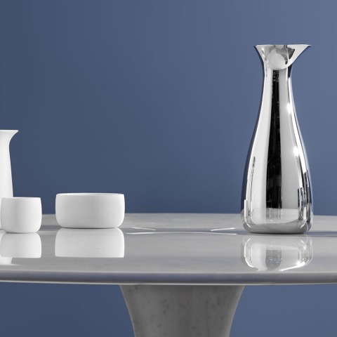 La gama tiene un enfoque ecléctico a la materialidad, vinculando las características únicas de acero inoxidable, porcelana y vidrio a través de la forma y de delicados detalles. Desde un discreto pero refinado set de vajilla de acero inoxidable, con copas de vino, jarras, cuencos y bandejas para la tarde, hasta una gama más informal de tazas de café de porcelana y vidrio, azucarero, termo y jarra de agua, los objetos están diseñados para una amplia gama de configuraciones y propósitos.
