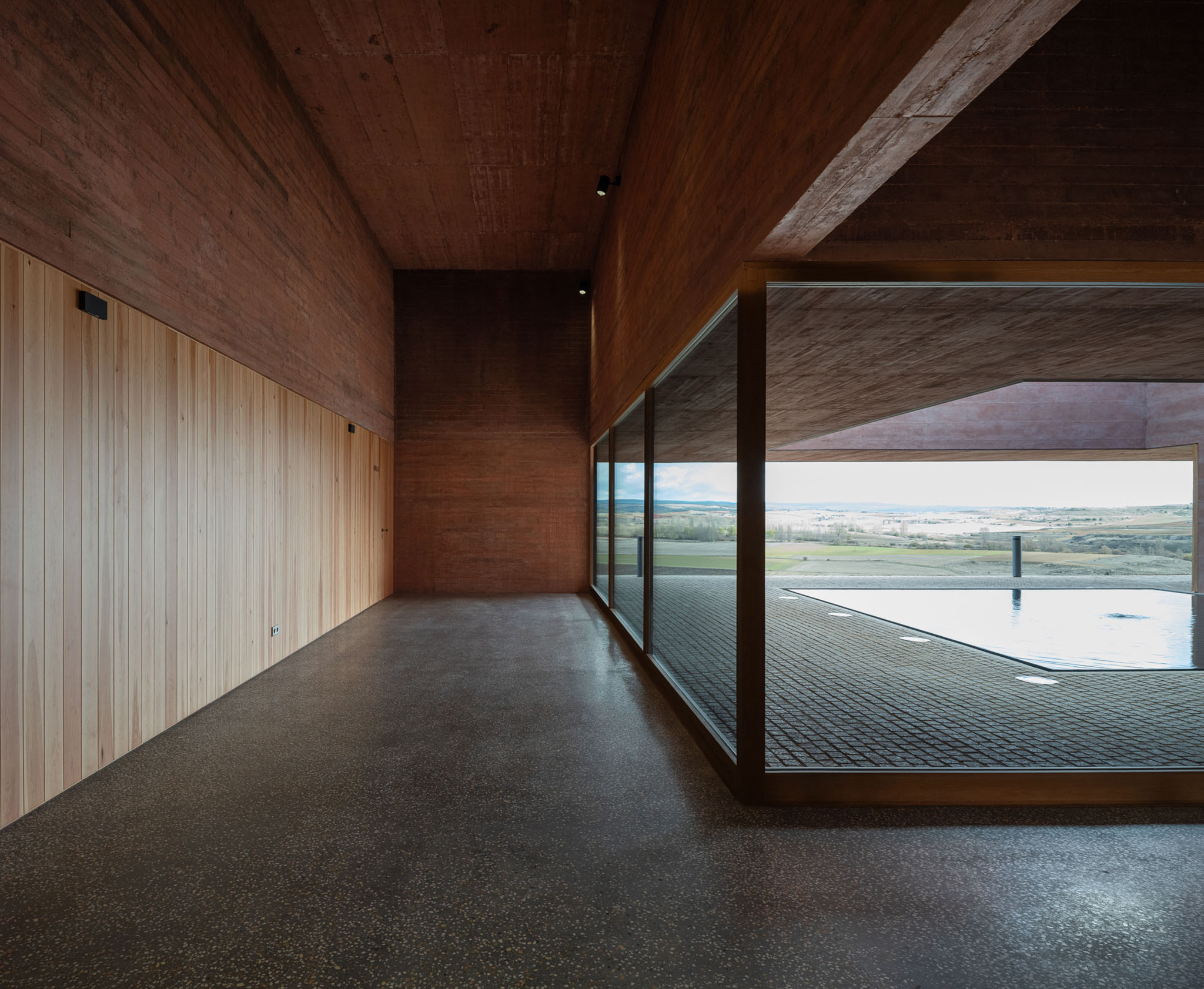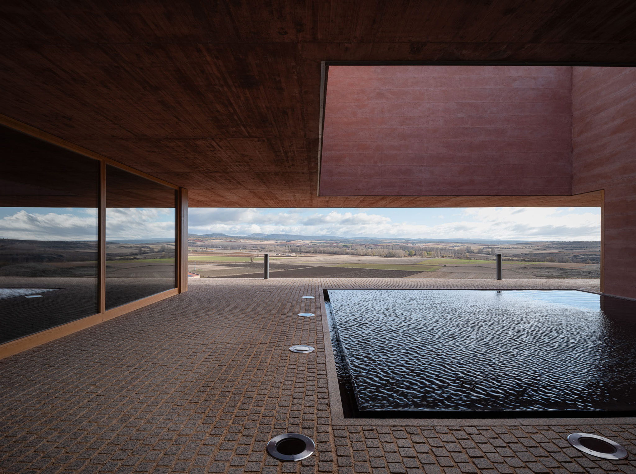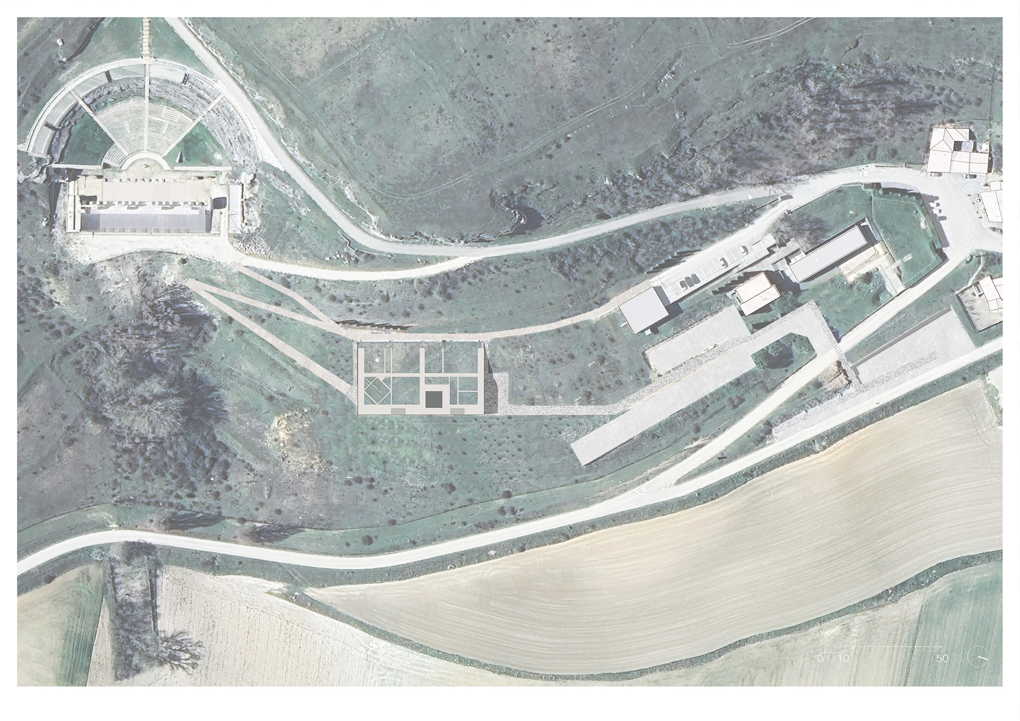 El objetivo es trasformar la secuencia de llegada, la acogida y la iniciación de la visita en un dispositivo territorial, paisajístico y arquitectónico. En la distancia se percibe como una plataforma topográfica, una excepción geometrizada en la pendiente natural del paisaje, integrada, apropiable y accesible. En el interior, como un espacio que surge de la tierra, cueva o abrigo que dialoga con el agua subterránea que abastecía a la ciudad romana.