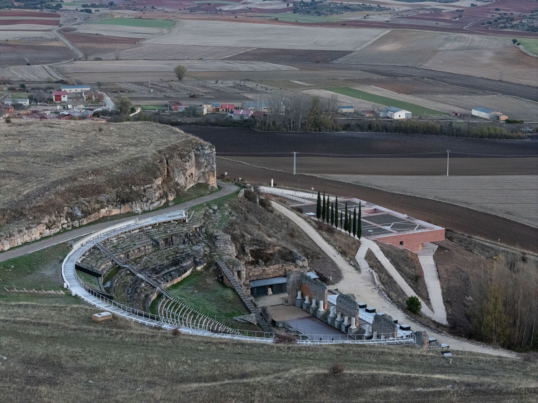 Además de perseguir una continuidad ecológica con la ladera y la vega de los ríos Argandilla y Dor, el edificio resuelve la conexión con el área arqueológica disponiéndose a la cota apropiada para facilitar el ascenso del visitante mediante un camino de suave pendiente hasta el Teatro Romano, primer gran hito de la visita a la ciudad romana.