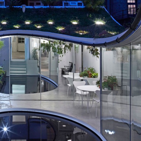 Una pared de espejos en el área exterior cubierta esconde un taller, área de cocina, cobertizo para macetas, tienda y jardinera profunda para los árboles pequeños en el techo verde de arriba. Debajo del patio, el sótano existente se ha ampliado para crear un dormitorio, dos baños y un pozo de luz lleno de vegetación. Animado por el sol y la lluvia, la extensión de un paisaje que alberga una familia de plantas de especímenes cuidadosamente seleccionados. El techo verde, la sala de jardín, el estanque reflectante y el pozo de luz hundido forman un jardín urbano de varias capas, que celebran y acercan a la gente a la naturaleza.