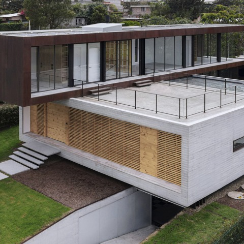 Esta vivienda de 515 m² se compone a partir de la superposición de 3 volúmenes desplazados en las tres coordenadas y en distintos niveles. El primer volumen se genera como una grieta y un vacío en el subsuelo, marcando un claro eje que conecta el ingreso vehicular con la piscina. En este nivel, se alberga un garaje taller de automóviles donde la iluminación y ventilación juegan un papel clave. El segundo volumen de hormigón está en sentido transversal al primer eje, en éste se encuentra programada la zona publica de la casa que tiene una relación directa con el patio posterior de la casa y busca generar permeabilidad con la calle de enfrente. El tercer volumen de acero cortén y planta rectangular contiene los espacios privados de la vivienda y se abre hacia la cordillera de los Andes, conectando los espacios internos con una terraza y el paisaje de Quito.