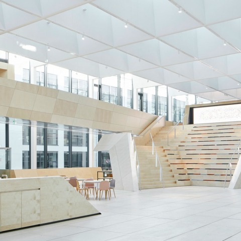 Una gran escalera abierta, que también sirve como punto de encuentro y arena, proporciona acceso al piso principal desde la plataforma de madera que está estructuralmente suspendida del techo. Las oficinas, salas de exposición y salas de presentación están integradas en esta estructura escultórica y similar a una galería de madera. Estas habitaciones están rodeadas por paredes de vidrio y el interior está dominado por materiales como la madera de roble, latón, vitrales y una variedad de textiles. En la planta principal, la cafetería también sirve como punto de encuentro y espacio social. El diseño conecta visualmente el nivel superior escultórico con el piso principal.