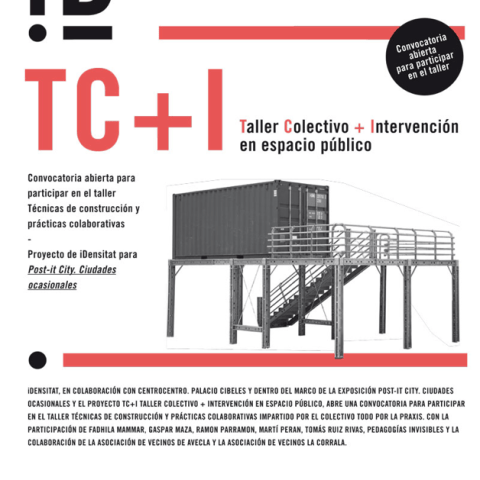 iDENSITAT, en colaboración con CentroCentro. Palacio Cibeles y dentro del marco de la exposición Post-it City. Ciudades ocasionales y el proyecto TC+I Taller Colectivo + Intervención en espacio público, abre una convocataria para participar en el taller Técnicas de construcción y prácticas colaborativas impartido por el colectivo Todo por la Praxis. Con la participación de Fadhila Mammar, Gaspar Maza, Ramon Parramon, Martí Peran, Tomás Ruiz-Rivas, Pedagogías Invisibles y la colaboración de la Asociación de vecinos de Avecla y la Asociación de vecinos La Corrala.