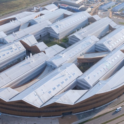 Utilizando un diseño circular, ya experimentado en otros proyectos, el anillo exterior y dos anillos interiores más pequeños albergan instalaciones académicas, espacios compartidos y un auditorio, mientras que las barras escalonadas se extienden a través del edificio para albergar talleres y laboratorios. Un gran sótano recorre la huella de la estructura para acomodar el soporte y las instalaciones técnicas. Una línea de techo de rompecabezas corta las barras y los anillos para unir la estructura.