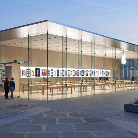 Con 180 pies lineales de cristal y tres entradas, rara vez ha sido una tienda de Apple tan visualmente reconocible y físicamente accesible. La estancia frontal transparente se hace sin columnas por la integración de finas aletas de vidrio estructurales, sirviendo la parte delantera de la tienda de apoyo al techo. Con tan sólo unas mesas de madera y una pared de piedra descansando en el suelo, el espacio bajo techo se deja libre para la exploración de los distintos productos.