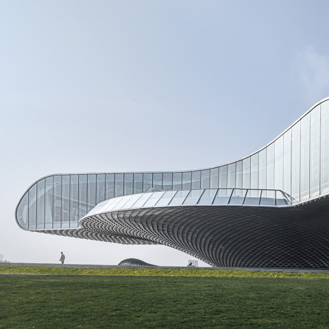La tecnología BIM se aplica a la placa de aluminio en forma de escala, que permite que más de 13 mil piezas de placa de aluminio encajen correctamente en la fachada y brinde una textura rítmica en espiral ascendente. La fachada real-virtual ha logrado un equilibrio perfecto en un aislamiento térmico eficiente y una iluminación natural adecuada. Todos los dispositivos electromecánicos están ocultos bajo tierra, y el techo y la piel del edificio forman un diseño integrado. La forma pura se realiza con la ayuda de la tecnología.