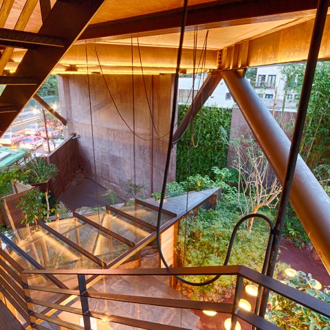 Los espacios interiores fueron diseñados como consecuencia de la estructura del volumen, dos muros estructurales que soportan mezzanines de acero, reforzados por una estructura secundaria de acero en la fachada.