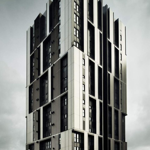 Materialmente, la fachada se construye con una lámina de 8 mm de espesor de resinas compactadas con núcleo fenólico suspendidas con una estructura oculta de aluminio reciclado. Los marcos negros son de un composite con base de aluminio y 4 mm de espesor que aporta igual resistencia con un peso por metro cuadrado inferior a cualquier otro material con las mismas prestaciones. Sintéticamente, todos los materiales usados en la construcción de la torre son 100% reciclables y específicamente los usados para la fachada provienen entre un 65% y un 100% de materiales ya reciclados.