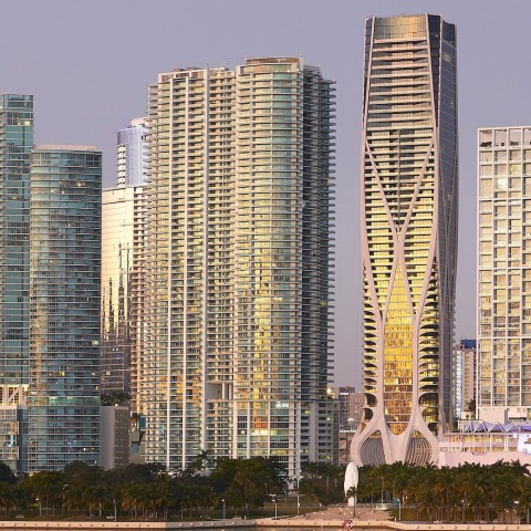 Leyendo de arriba a abajo como un marco continuo, las columnas en su base se despliegan a medida que la torre se eleva para encontrarse en las esquinas, formando un tubo rígido altamente resistente a las exigentes cargas de viento de Miami; Sus soportes curvos crean corchetes diagonales resistentes a los huracanes.