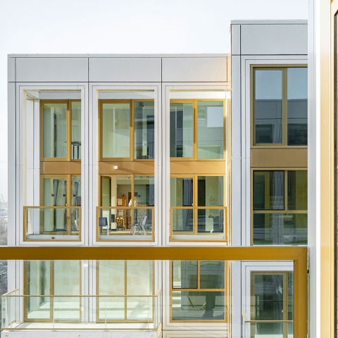 Una paleta de colores claros uniforme y un patrón de fachada reconocible garantizan la unidad global del zócalo y las torres de media altura. La fachada en forma de rejilla se inspira en las aberturas ornamentadas de los edificios neoclásicos de Scheepvaartkwartier, pero les da una reinterpretación contemporánea con revestimiento de aluminio blanco crema, ventanas de bronce y detalles refinados. Todas las aberturas tienen triple acristalamiento, lo que reduce las necesidades energéticas y crea interiores de alta calidad con amplia luz natural y grandes vistas para todos los apartamentos.