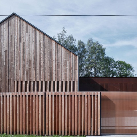El diseño se inspiró en las viviendas tradicionales del pueblo, pero le dio a la casa una apariencia distintivamente contemporánea. Dos volúmenes crean una forma en L; una estructura más pequeña con un techo plano y revestimiento de acero oxidado se encuentra con el edificio de madera más alto que cuenta con un techo en forma de A y techos de doble altura, así como revestimiento de madera de abeto reciclado y chamuscado.