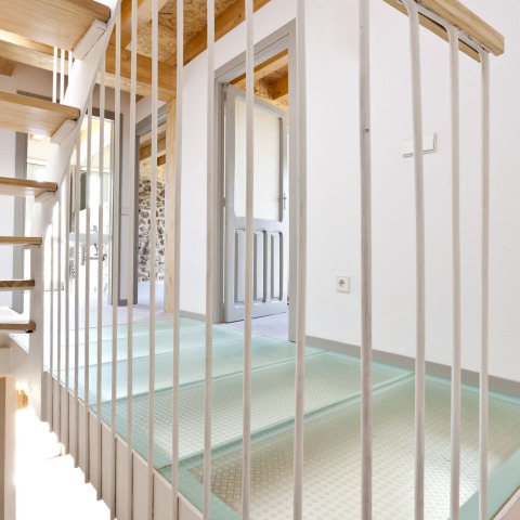 Existe una transición entre el mundo más masivo húmedo en contacto con el terreno, de muros vistos de piedra, con pavimento de hormigón donde se ha recuperado la escalera existente de terrazo, con el mundo seco y ligero de las cajas de madera que se relaciona con el primero a través de una escalera ligera y colgada, que funciona de lucernario y proyecta luz hasta la planta baja más oscura de la vivienda a través de un forjado de vidrio.