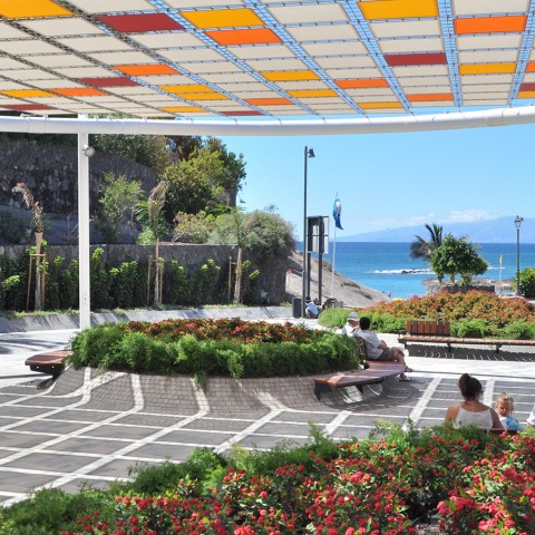 En el espacio previo a la Playa del Duque se transforma la superficie de aparcamiento en un espacio urbano singular de esparcimiento peatonal que supondrá una referencia en la costa del Municipio de Adeje. Para ello se incorporan unas grandes pérgolas para la generación de sombra y se insertan nuevas jardineras circulares que distribuyen el espacio urbano creando zonas de estancia y zonas de juego intercaladas en un espacio fluido y bien conectado que mejora sustancialmente la relación entre playa, comercio, ciudad y paisaje.