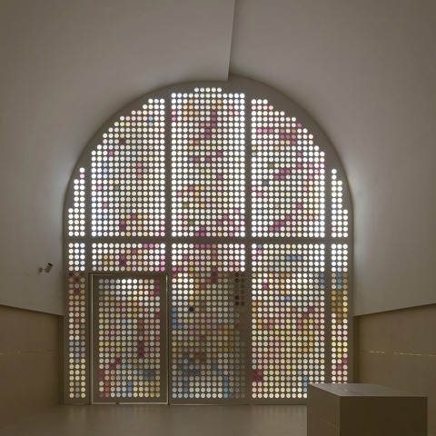 Este se completa con una gran vidriera abstracta (o interpretación de esta) que actúa como filtro de separación y donde sitúa la puerta de entrada a la capilla. Esta vidriera aporta destellos de luz coloreada arrojada sobre una atmósfera intencionadamente homogénea.