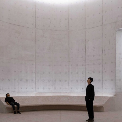 La rotonda de meditación en la planta baja tiene nueve metros de altura. Al dejar un espacio de cincuenta centímetros de ancho con paneles de vidrio maniobrables en las esquinas de las paredes, la luz natural se difunde suavemente a través de los espacios de las esquinas inferiores, así como desde los espacios superiores alrededor del escenario suspendido. Hay asientos de hormigón pulido dispuestos a lo largo de la pared, que se asemejan a un sillón, lo que permite a las personas reclinarse de forma natural y sumergirse en la música, la luz natural y la brisa penetrante. En este volumen deliberadamente sólido de la Capilla, hemos incorporado una gran ventana panorámica en la fachada este, brindando al público la oportunidad de contemplar el horizonte del mar al salir después del concierto.