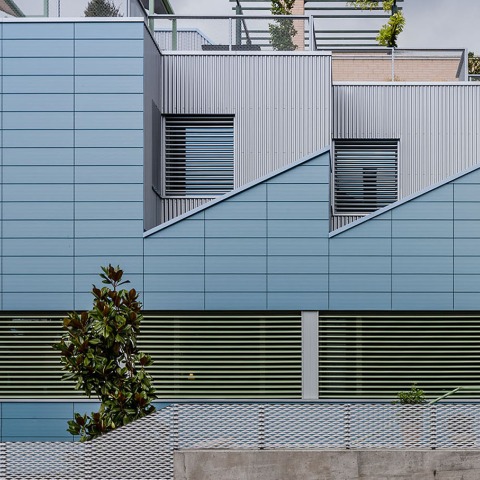 Finalmente, una serie de estrategias formales y tecnológicas interconectadas favorecen la eficiencia energética y la calidad ambiental del proyecto. El complejo volumen de la casa permite que la mayoría de sus habitaciones se abran a más de una fachada, facilitando la ventilación cruzada y el enfriamiento natural, que se ven realzados por la escalera que funciona como un conducto de aire. Las ventanas operables en el techo en forma de diente de sierra de la sala mejoran tanto la iluminación como la ventilación en este espacio clave. Las persianas automatizadas en las ventanas controlan las ganancias de calor y la iluminación desde diferentes orientaciones. Una estructura prominente en el techo optimiza la orientación de los paneles solares que alimentan un sistema extremadamente eficiente de calefacción y refrigeración por suelo radiante. Combinados con una fachada de muro cortina ventilada trasera con revestimiento cerámico ventilado y paneles de acero corrugado, estos sistemas garantizan que no se necesitará aire acondicionado en el proyecto, incluso en las condiciones climáticas extremas de Madrid. Concebidas como enfoques superpuestos para potenciar la vida de sus ocupantes de edad avanzada, estas estrategias también están comprometidas con la preservación de los derechos de las generaciones futuras.