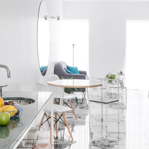 El espacio principal alargo sirve como zona de vida pero también como área de cena y de cocina; Es una galería viva más que una sala de estar. Su pared curvada está marcada por puertas pintadas a mano en diferentes tonos de azul, colgando separadas del suelo como un conjunto de pinturas monocromas. Hay un choque cuidadosamente calibrado entre la ligereza de la curva y la rigidez de su alzado.