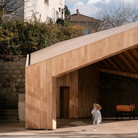 El patio de recreo cubierto de la escuela está en la parte trasera del patio, lo que hace que parezca un castaño centenario donde el poder de un tronco de gran tamaño por el tiempo sostiene un follaje imponente. Imaginado como una masa homogénea que narra la volumetría vecina, aterriza sobre columnas que parecen troncos de castaño arraigados en este lugar durante generaciones.