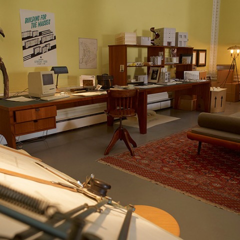 Visitando la exposición uno rápidamente detecta que no está en un espacio corbusierano (perdón por la expresión), todo es un poco decadente, sofás georgianos, extraños sirvientes, algunos malos retratos por las paredes, revistas de Architecture Review, libros apilados en grandes estanterías con temas que van desde el Urbanimo a la Fenomenología de la percepción de Merleau Ponty.