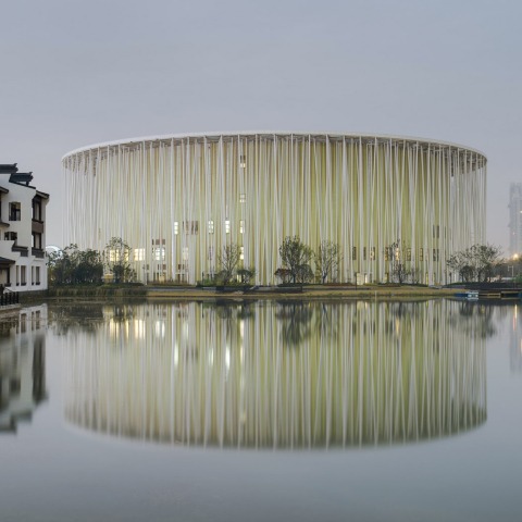 Por la noche, la envolvente del edificio se ilumina desde abajo, convirtiéndose en un faro etéreo, vislumbrado entre el bosque de columnas de "bambú", atrayendo a espectadores y público desde el otro lado del lago y las urbanizaciones circundantes.