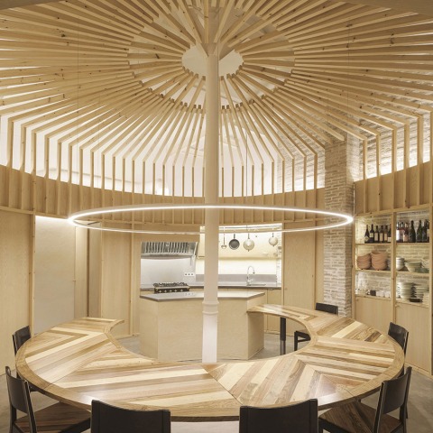 Mediante un biombo curvo de madera de fresno cuyo centro geométrico es el pilar, se define el espacio central del taller gastronómico, reservando el espacio intermedio surgido entre la cara convexa de la circunferencia y los límites del local para las pequeñas estancias necesarias. Se ofrece así una lectura clara del espacio en la que los usos servidores quedan desplazados a los márgenes e integrados en la geometría curva, evitando la proliferación de elementos que enturbien la compresión de un lugar reducido como éste. Al ascender, el paramento curvo del biombo se desmaterializa en su cota superior, restando únicamente los rastreles que lo soportan fugados hacia el pilar central, así construimos una estructura que permite recrear una atmósfera envolvente que además vela las instalaciones y los refuerzos de la estructura existente.