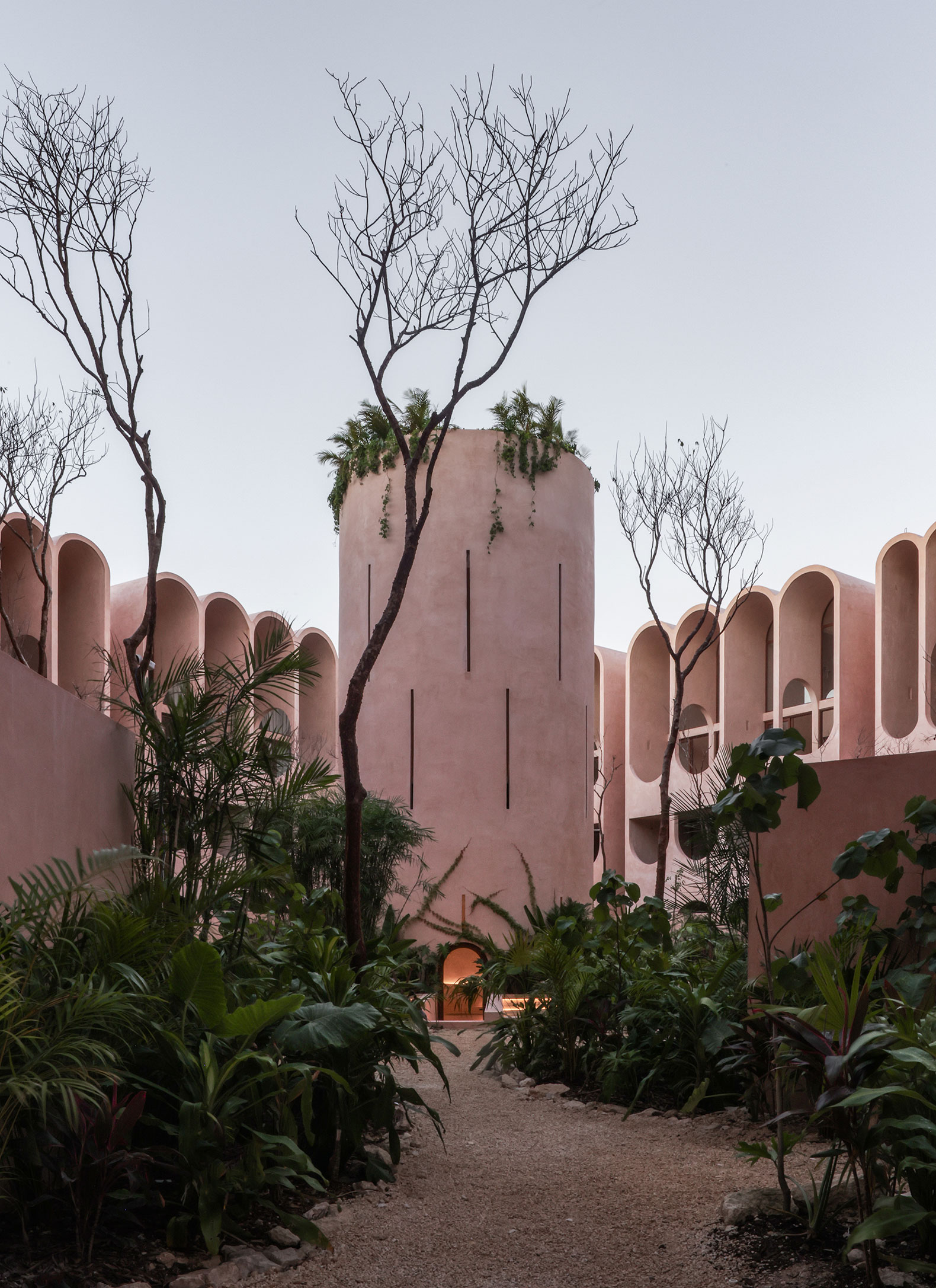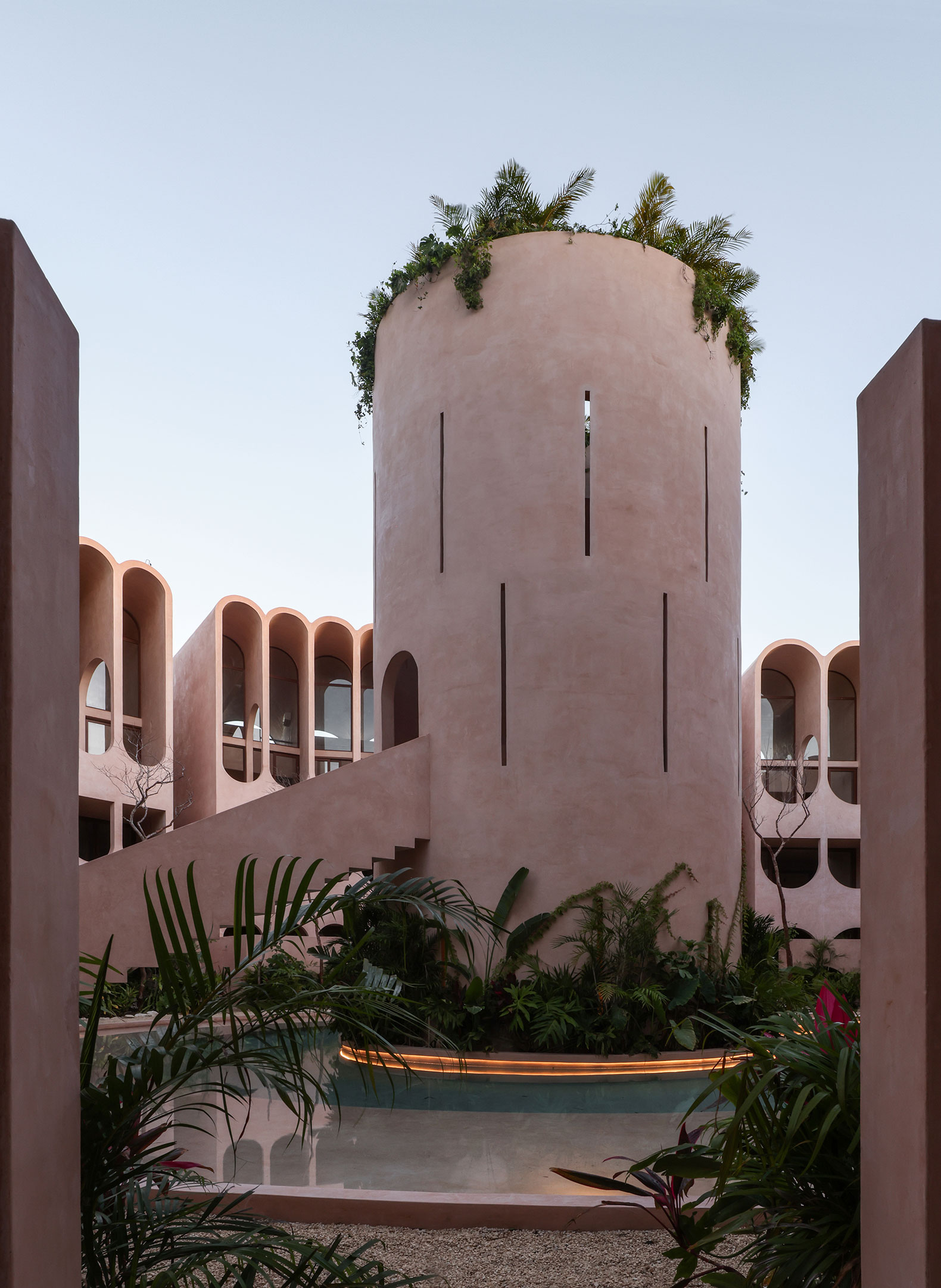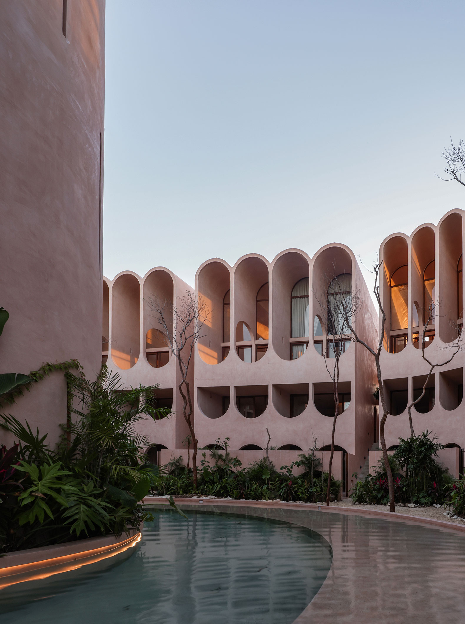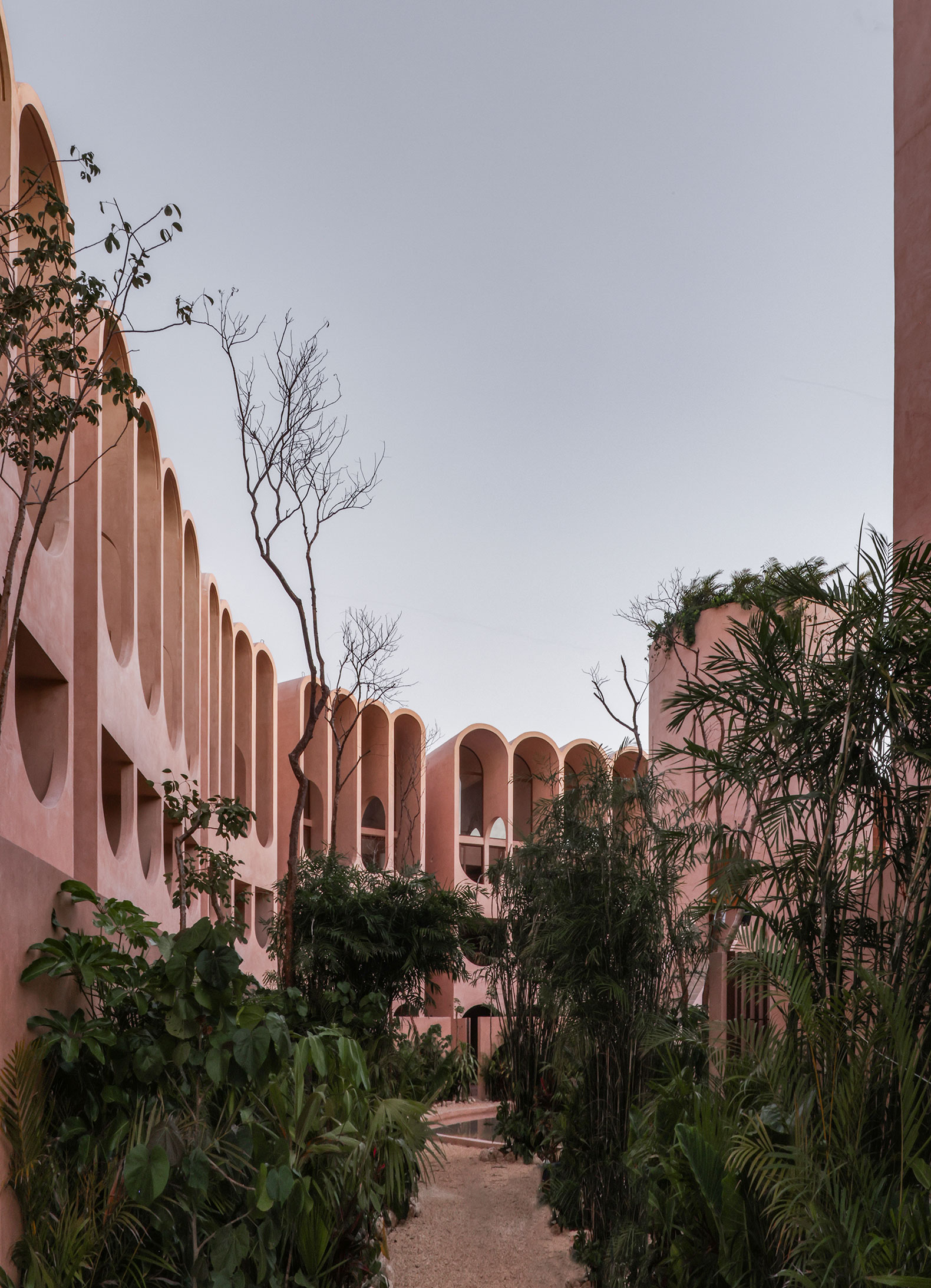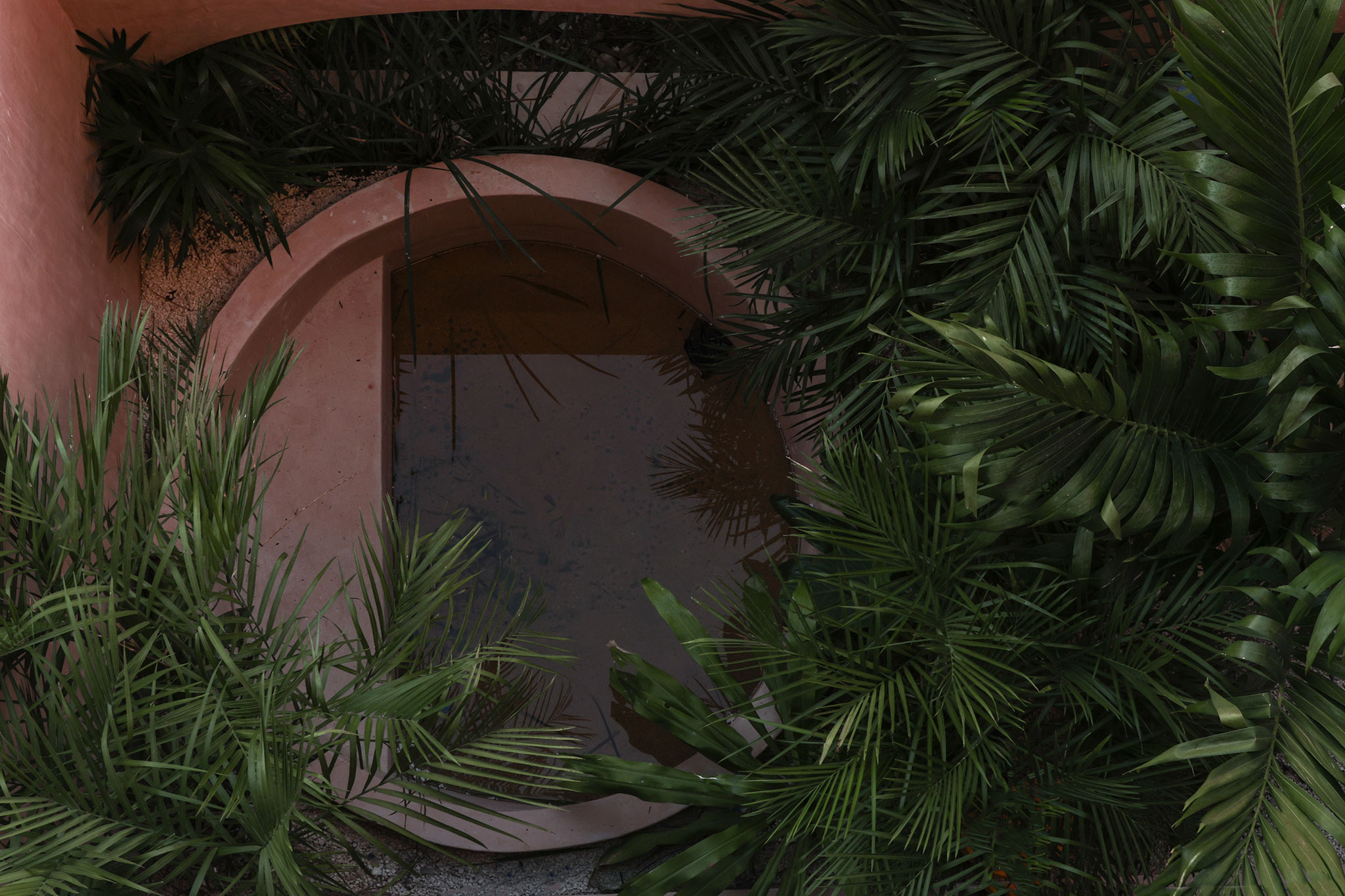 V Taller proyecta el conjunto reduciendo su huella sobre un terreno permeable a su recarga acuífera, concentrando el programa en altura y dejando que el patio interior, que se encuentra abierto en sus extremos, dialogue con la vegetación tropical del entorno cercano. El resultado es un conjunto formado por 59 habitaciones en tres niveles, organizadas en dos volúmenes curvos complementarios que abrazan un vacío central cuya composición tiene forma de ojo. El resto del programa está compuesto por zonas de coworking, spa, restaurante y bar, jardín, estudio de yoga y una sala ASMR, entre otros.