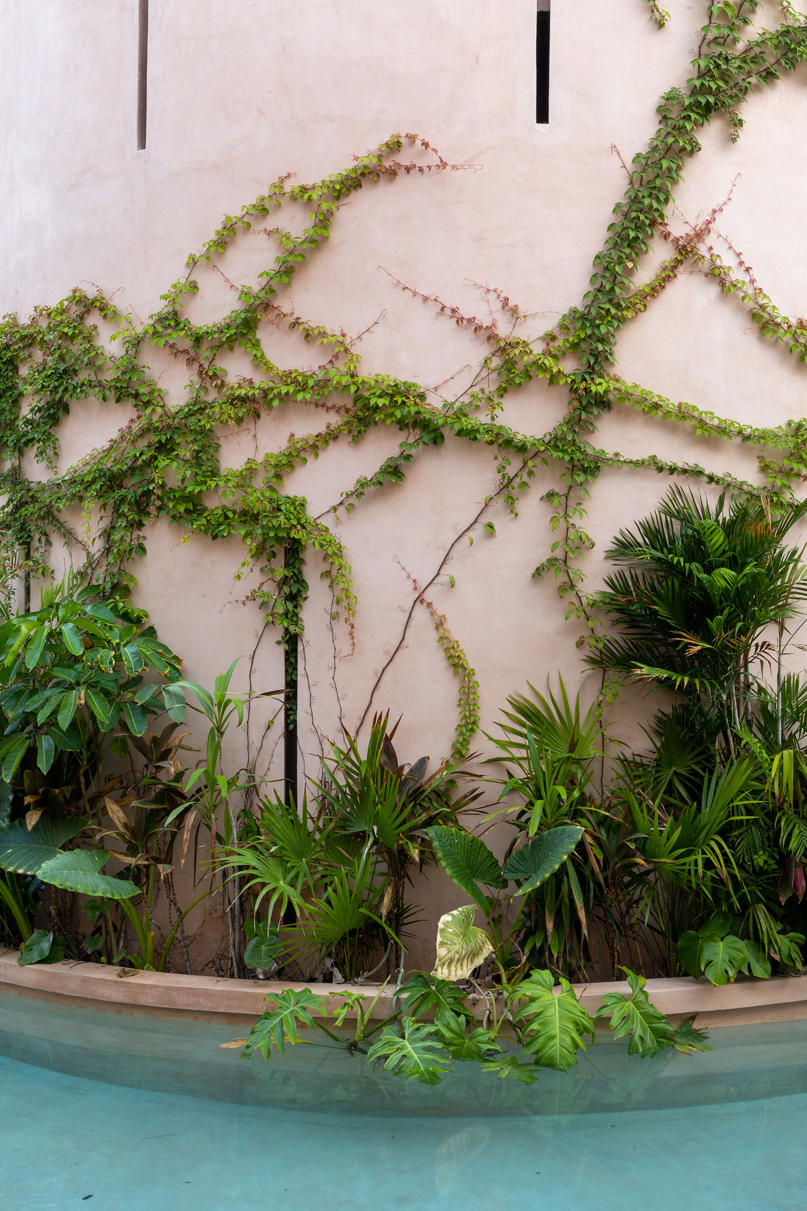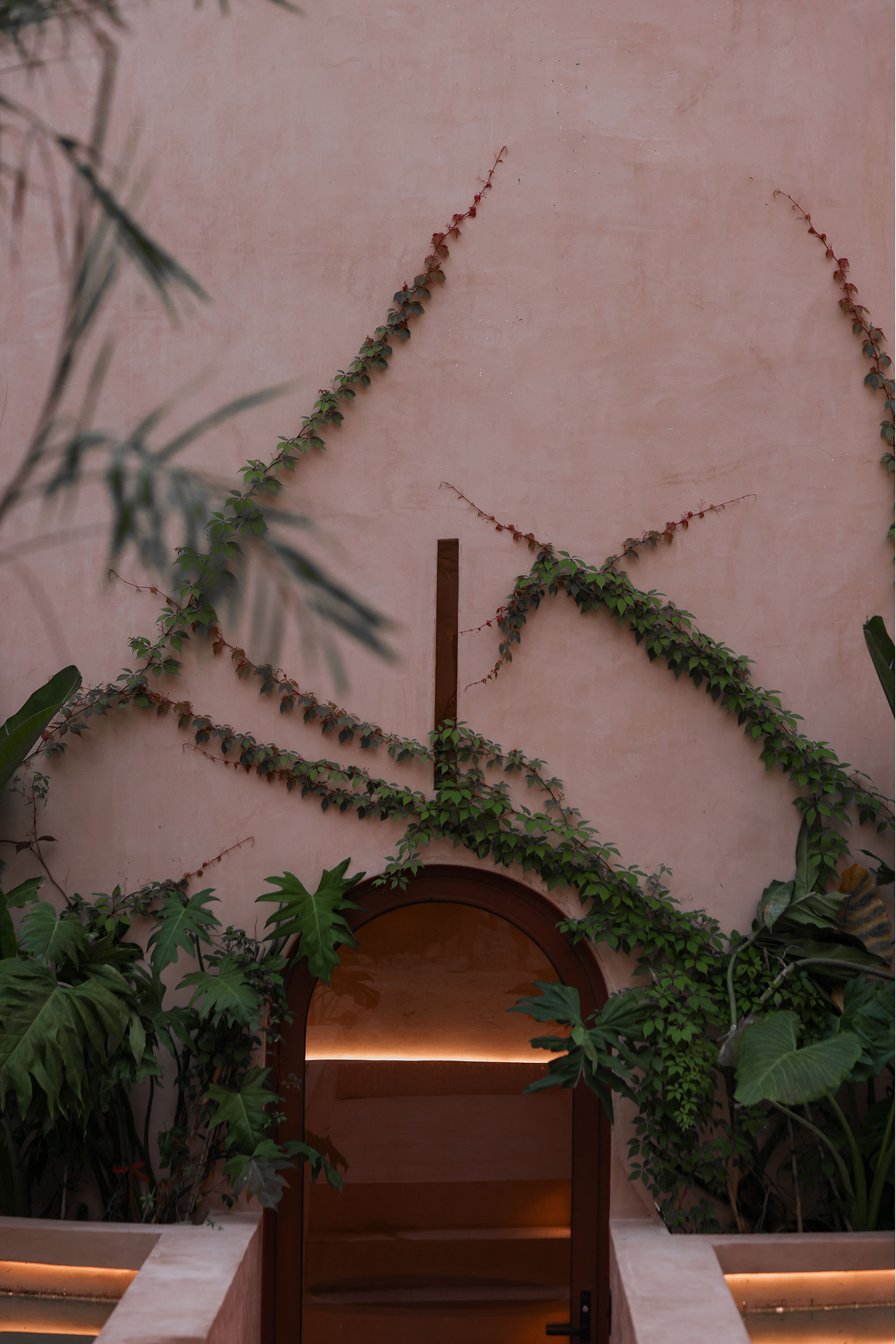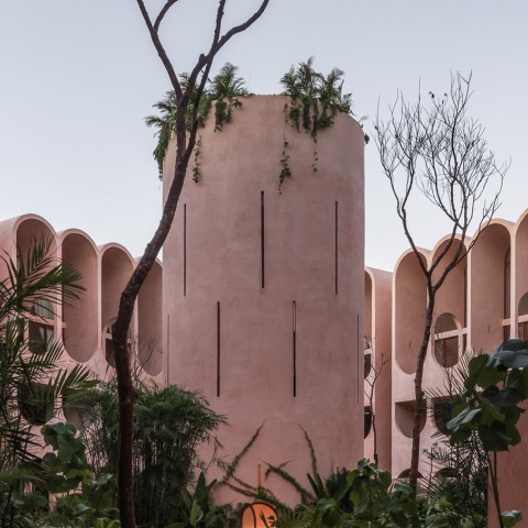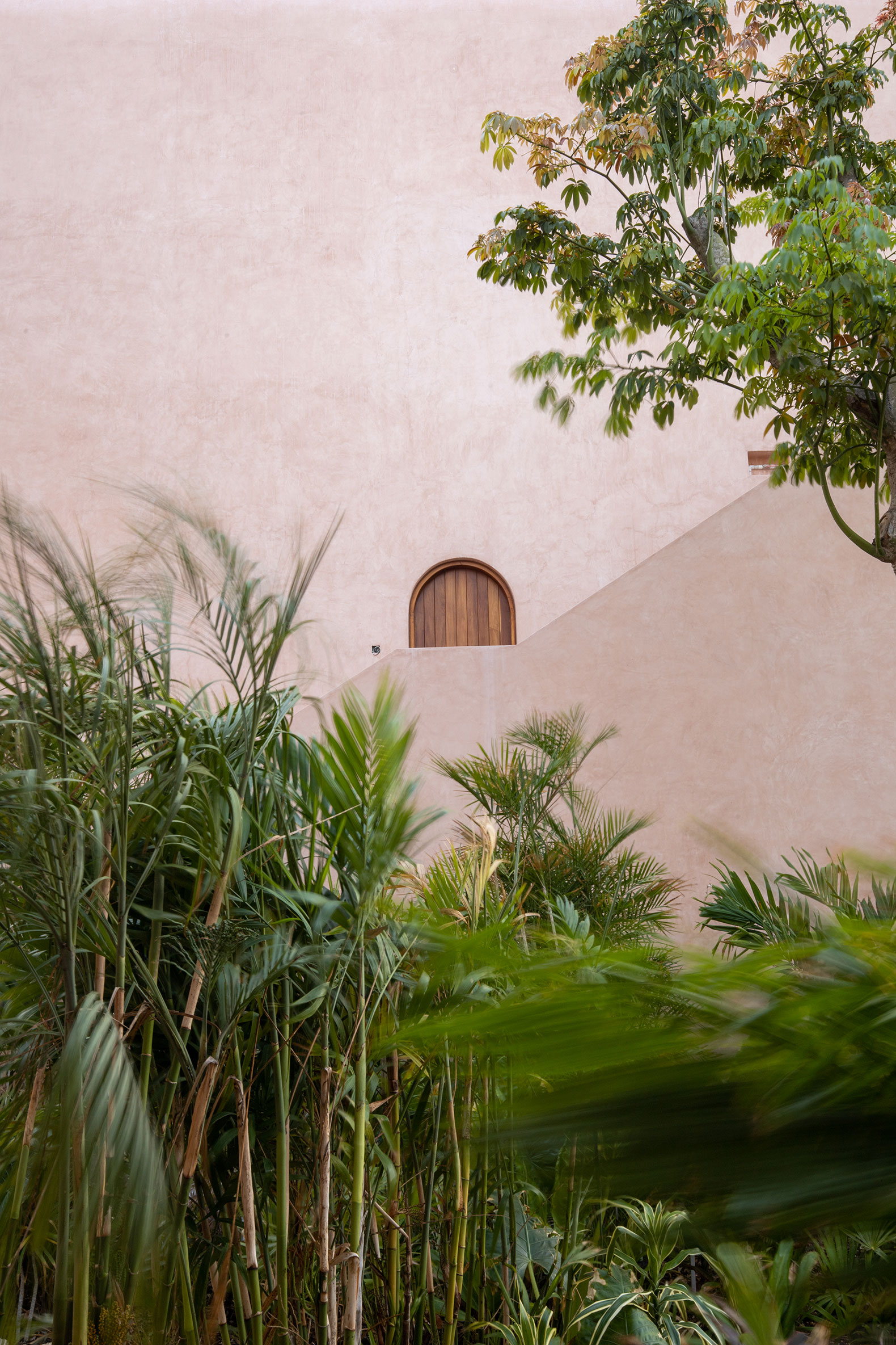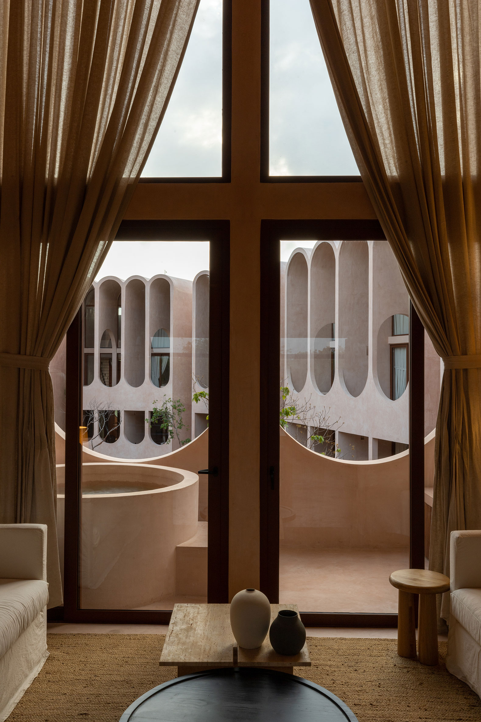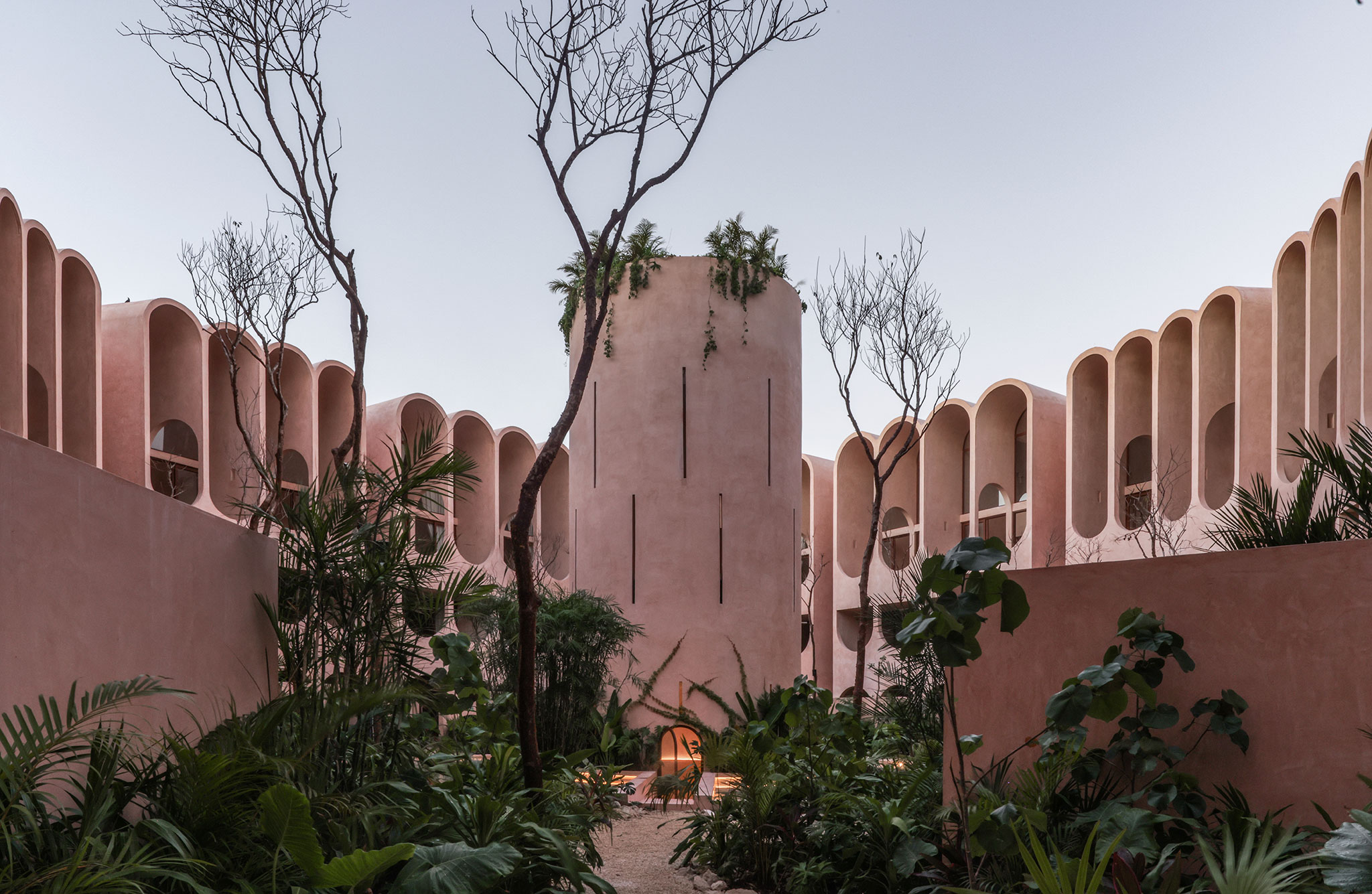 V Taller proyecta el conjunto reduciendo su huella sobre un terreno permeable a su recarga acuífera, concentrando el programa en altura y dejando que el patio interior, que se encuentra abierto en sus extremos, dialogue con la vegetación tropical del entorno cercano. El resultado es un conjunto formado por 59 habitaciones en tres niveles, organizadas en dos volúmenes curvos complementarios que abrazan un vacío central cuya composición tiene forma de ojo. El resto del programa está compuesto por zonas de coworking, spa, restaurante y bar, jardín, estudio de yoga y una sala ASMR, entre otros.