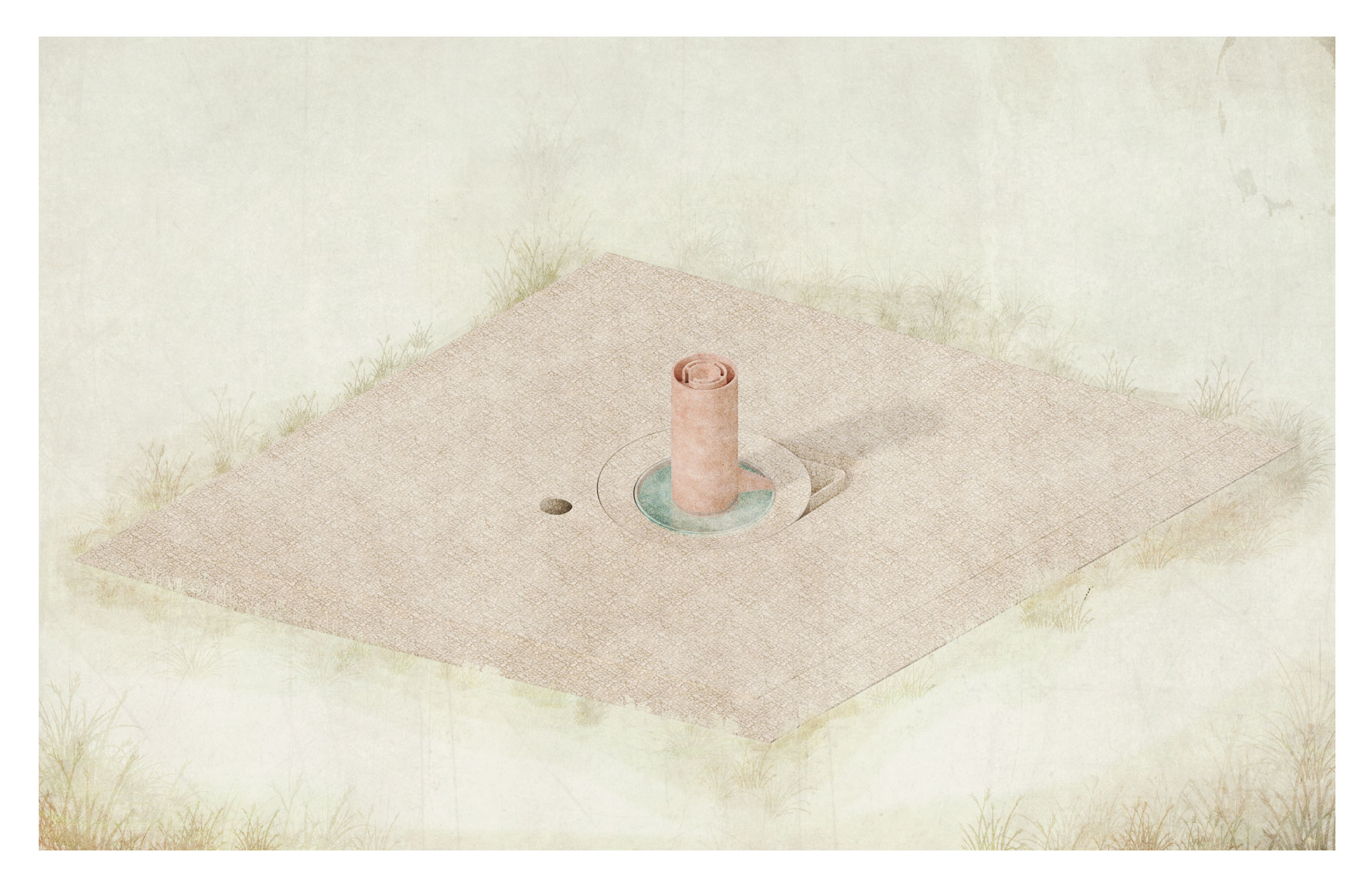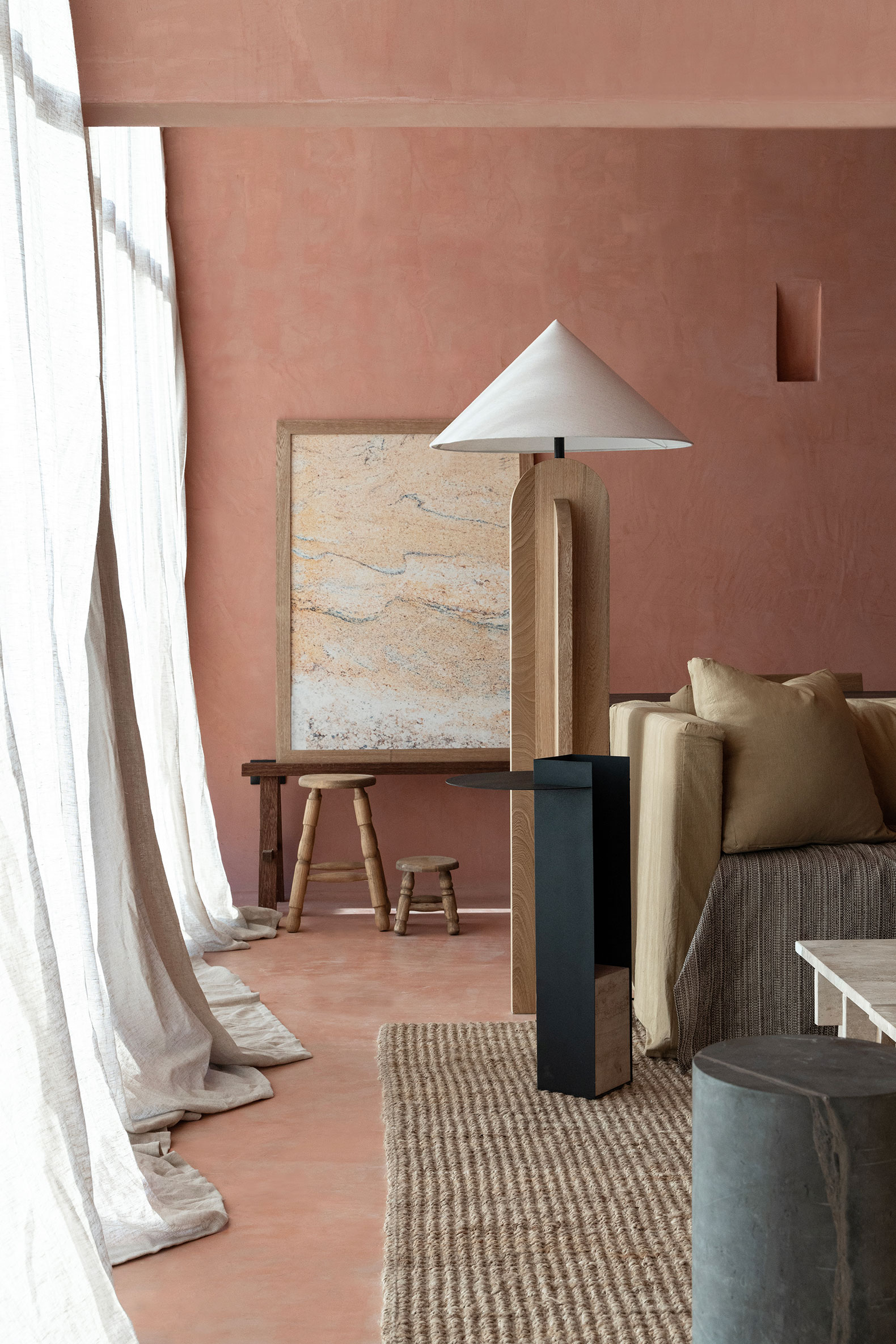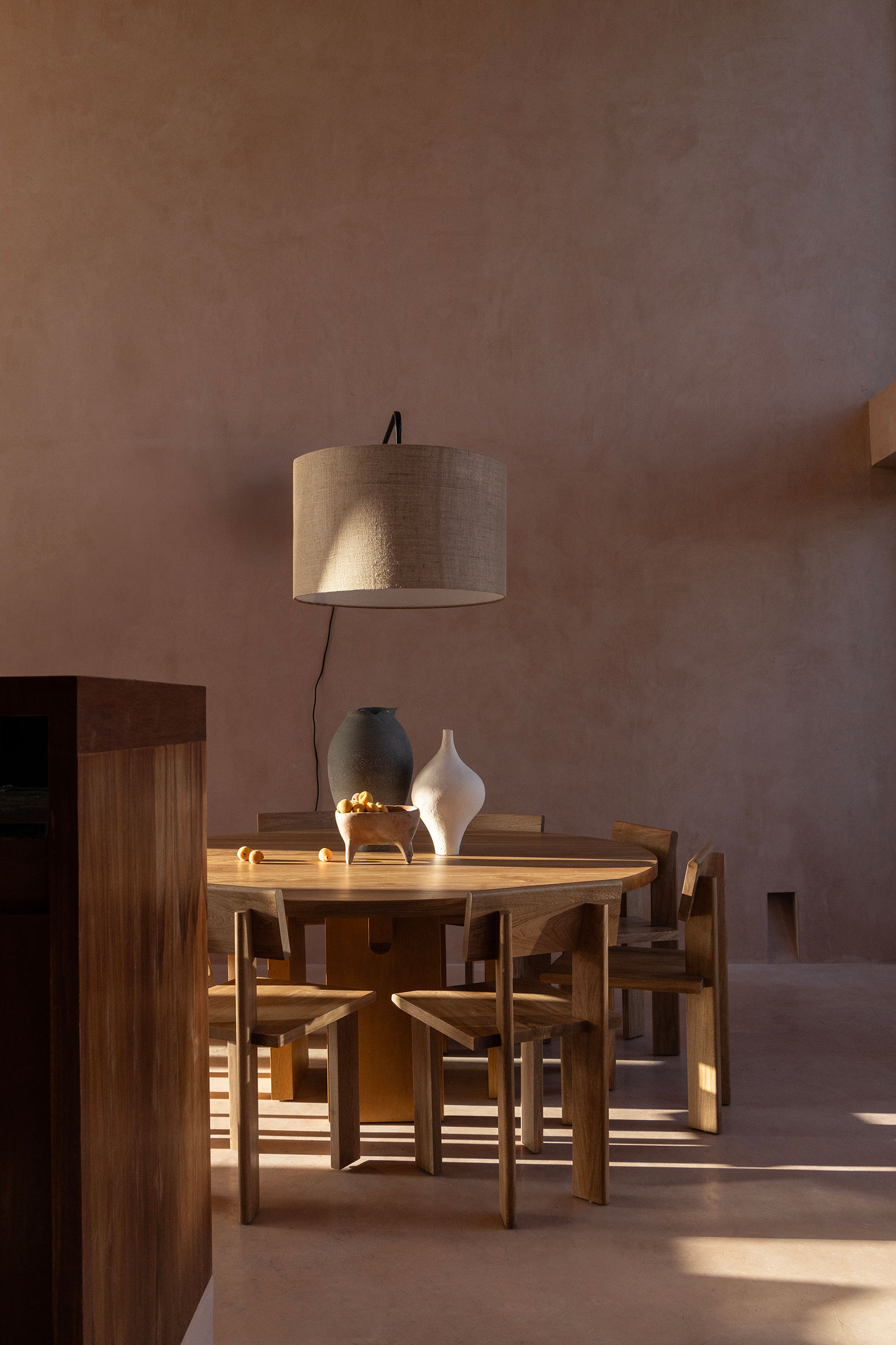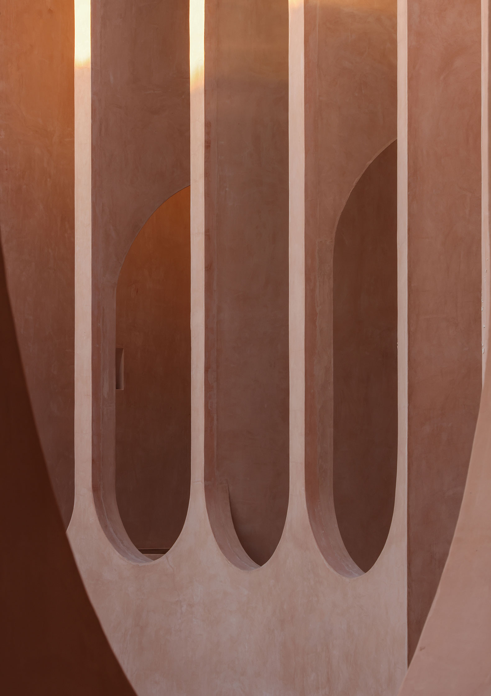 La torre solicitada por el cliente encuentra su lugar exacto en el centroide geométrico de esas dos curvas. No se impone como hito arbitrario; organiza, orienta, ordena. Su presencia es neurálgica: estructura recorridos, entrega un eje de referencia y, al mismo tiempo, respeta la fluidez del patio. El interior de la torre reinterpreta la tradición de los hammam: control riguroso de la luz, materialidad sobria, atmósferas capaces de conducir a la introspección. Pequeñas aberturas cenitales filtran la iluminación natural y dejan que el día vaya dibujando un relieve cambiante de sombras. El cilindro culmina en una abertura triangular que funciona como mirador de estrellas; la mirada se aísla de distracciones laterales y asciende, limpia, para hacer del cielo un material más del proyecto.