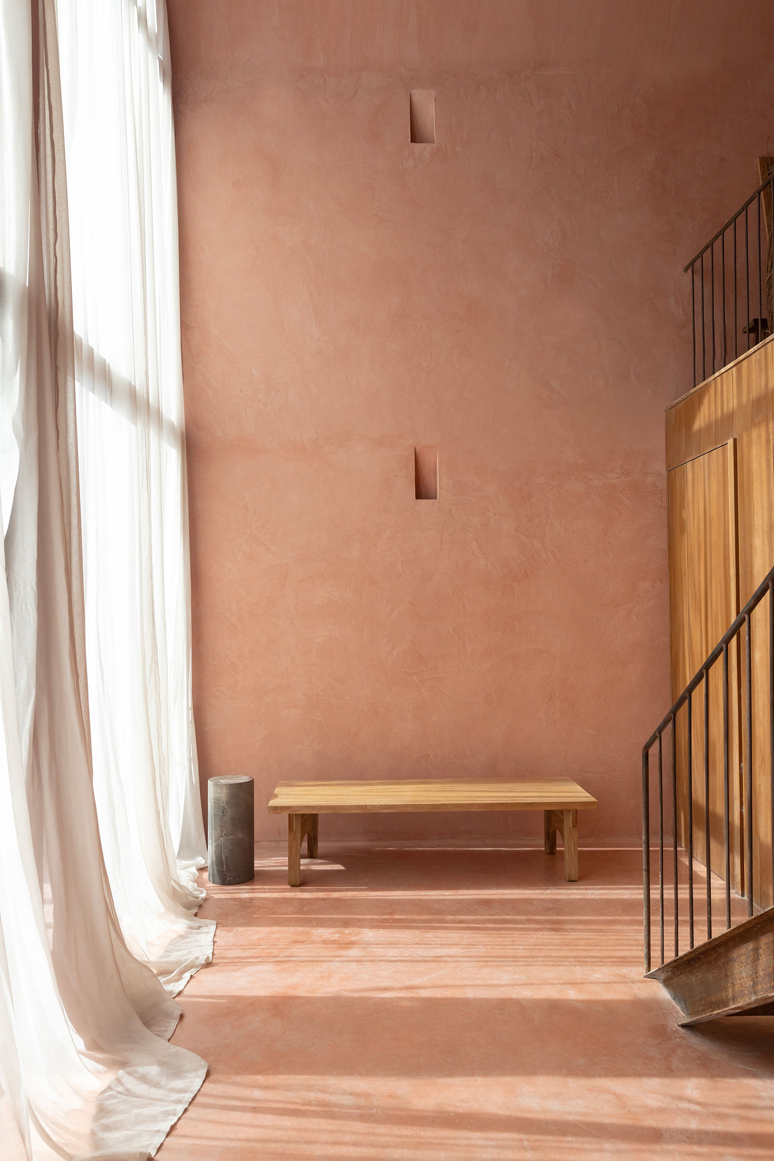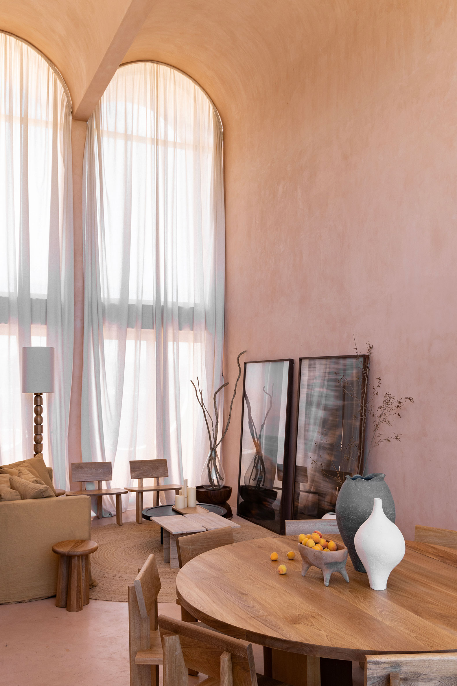 La materialidad sostiene esa agenda climática sin perder anclaje cultural. El aplanado principal es chukum, un estuco tradicional a base de cal de la península de Yucatán cuya conductividad térmica mejora frente a acabados sintéticos típicos. Además de su inercia higroscópica, este material minimiza mantenimiento —intervenciones mucho menos frecuentes que las de un estuco convencional— y prolonga la vida útil del acabado potencialmente más allá de los rangos comunes de 50–80 años, con una pátina mineral que integra el edificio al paisaje. Dentro de las unidades, una paleta desaturada, textiles blancos —principalmente lino— y maderas tropicales—como el Tzalam, Machiche y Parota— en carpinterías y mobiliario prolongan la calidad de la luz y dialogan con el contexto. Piezas de barro funcionan como acentos artesanales que anclan la experiencia en saberes locales. No se trata de una estética neutra, sino de una sobriedad activa que permite que sean el clima, la sombra y los sonidos de la vegetación quienes completen la escena cotidiana.
