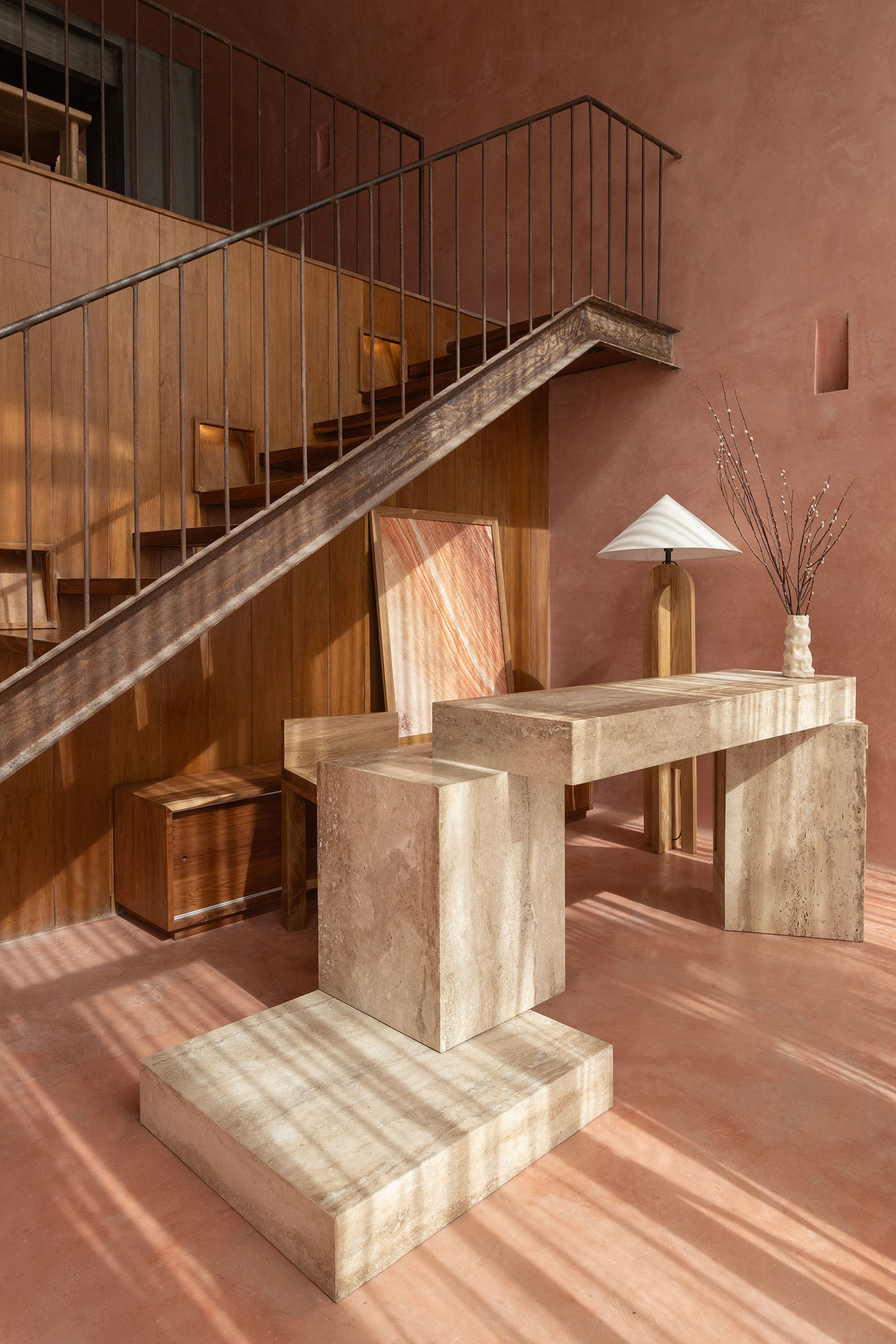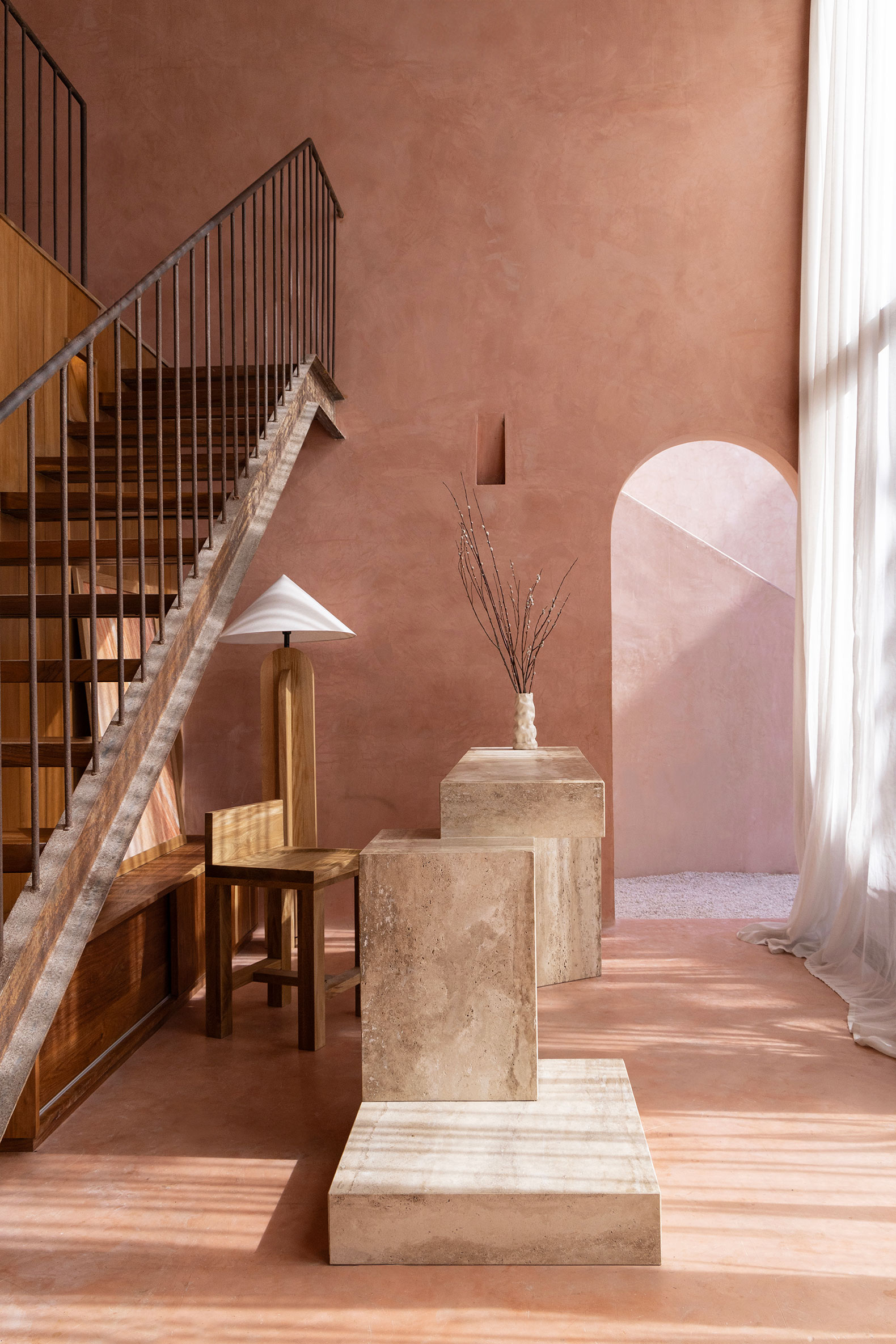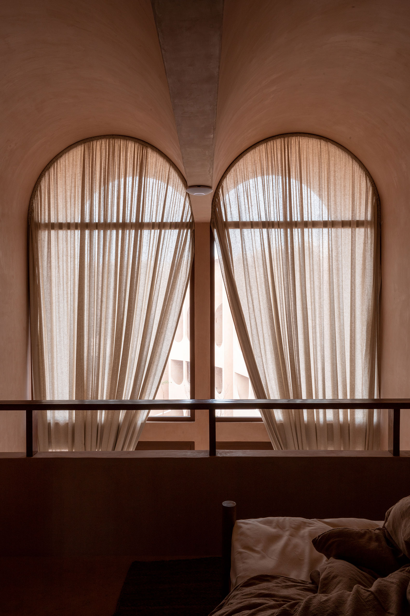 La luz, en todo el conjunto, se convierte en estructura. La interacción entre superficies curvas y radiación natural hace que muros y bóvedas cambien de carácter con las horas. El acceso a las unidades condensa esa pedagogía espacial: escaleras concebidas como túneles de luz conducen en ascenso, estrechas y precisas, hasta que la iluminación cenital guía el último tramo y el espacio se abre con dobles alturas y arcos que expanden el volumen. La secuencia de compresión y descompresión enseña a leer el edificio, a entender que la arquitectura se mueve al ritmo de la luz, que cada umbral reprograma la atención.