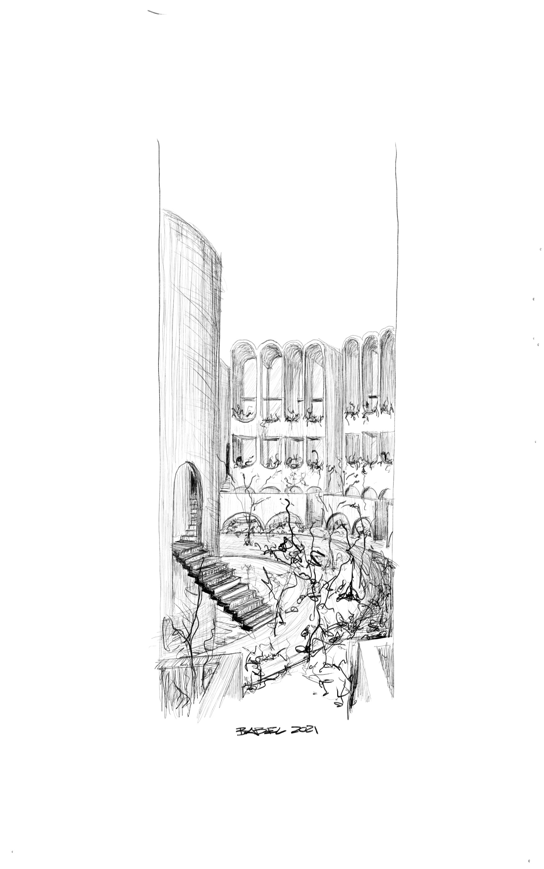Babel se caracteriza por su composición formal a través de muros y una seriación de arcos, cuya orientación y escalonamiento permiten canalizar corrientes de aire fresco; arcos y bóvedas colaboran en la disipación del calor, generando cámaras y sombras profundas que estabilizan el interior. En este contexto, el arco adquiere su triple condición: estructural, lumínica y simbólica.