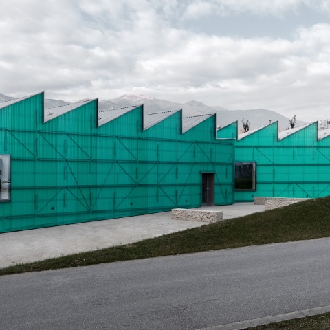 La fachada de fibra de vidrio verde tiene un costo muy limitado (alrededor de 5 euros / m2), pero puede constituir un fuerte carácter expresivo del edificio. El material protege y revela al mismo tiempo unas cincuenta lámparas LED lineales que iluminan la plaza que alberga la entrada peatonal.