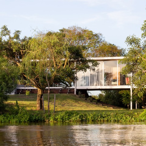 La casa se eleva sobre un primer nivel en previsión de posibles inundaciones. Se incorporó un terraplén que facilita el acceso a la misma en caso de inundación, y al mismo tiempo busca integrar la casa con el terreno, mejorando la accesibilidad hacia el interior de la vivienda.