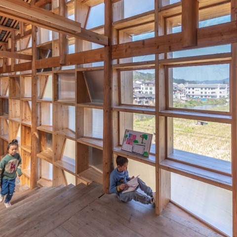 Imagine una escalera que nunca termina, un bucle infinito de contrahuellas y peldaños encajados en una casa de madera tradicional. La escalera no tiene destino; es el destino mismo. Las paredes de la casa se han transformado en una matriz de estanterías y ventanas. La Casa del Libro de Pingtan es un lugar donde los niños leen y juegan al mismo tiempo, un nuevo paradigma de las bibliotecas de las aldeas rurales de China.