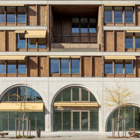 En los dos niveles de la planta baja, su estructura se eleva en proporciones elegantes con arcos de hormigón en bruto con bajas emisiones de carbono vertidos in situ. Algunos arcos se elevan en ocasiones en dos niveles y se inspiran en el lenguaje arquitectónico histórico local, al tiempo que estructuran la nueva plaza y promueven la reactivación de la vida del barrio. En los cinco pisos superiores que componen los dos edificios, la expresión se vuelve más ligera al lucir fachadas con marcos de madera con aislamiento de fibra de madera, carpintería de madera y persianas de colores cálidos, y revela la rica y variada programación del proyecto.