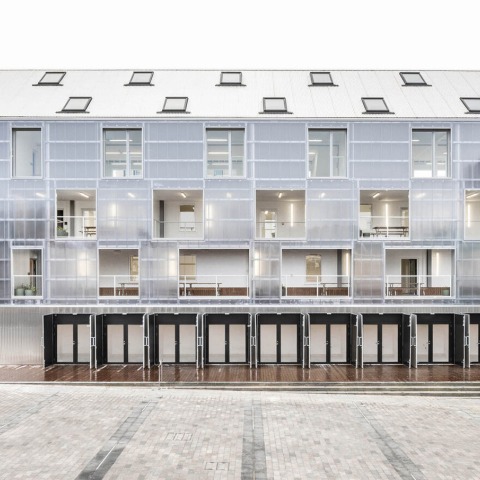 Finalmente, el edificio se envuelve con una fachada de policarbonato homogéneo y se completa con una base y cubierta de aluminio perfilado acabado fresado. La piel liviana y reflectante crea la apariencia de una forma singular, sin embargo, en una inspección más cercana, el carácter translúcido del material permite que la fachada de ladrillo pintado de blanco y la terraza permanezcan visibles desde el exterior. Detrás, la fachada permite que entre mucha luz a los espacios de trabajo y de descanso. Durante el día, el revestimiento refleja los colores cambiantes del cielo y el ambiente externo mientras brilla por la noche para revelar las actividades internas.