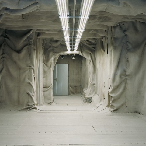 El acceso mediante un pórtico de piedra te introduce en una sala que con gran precisión técnica y de ejecución logra que el hormigón se diluya en diferentes pliegues que simulan ser un tejido que se abre paso a través del edificio. El proyecto consigue que las miradas de los visitantes se centren en la exposición de prendas coloridas gracias al contraste con el gris neutro del hormigón que envuelve la sala.