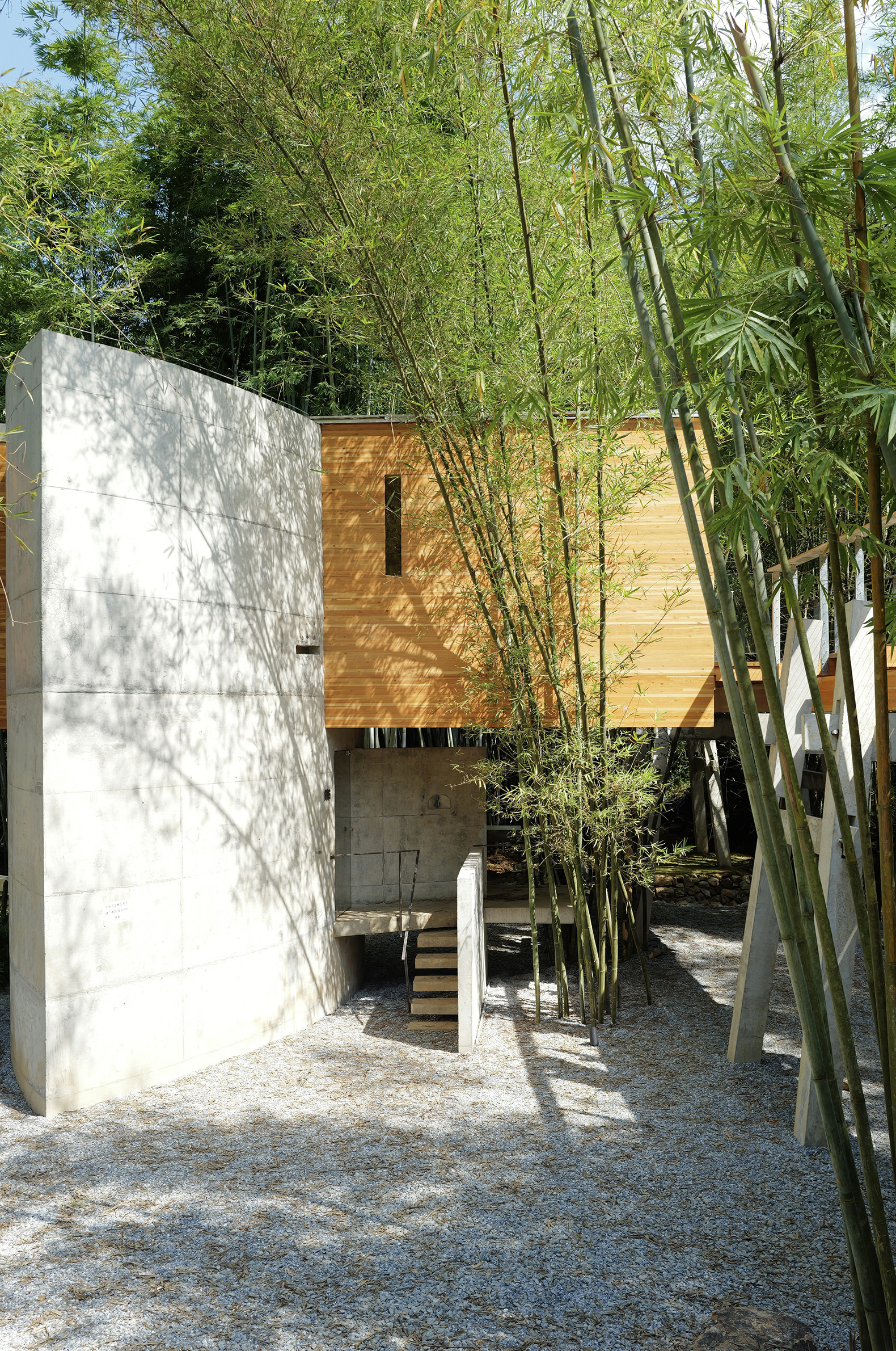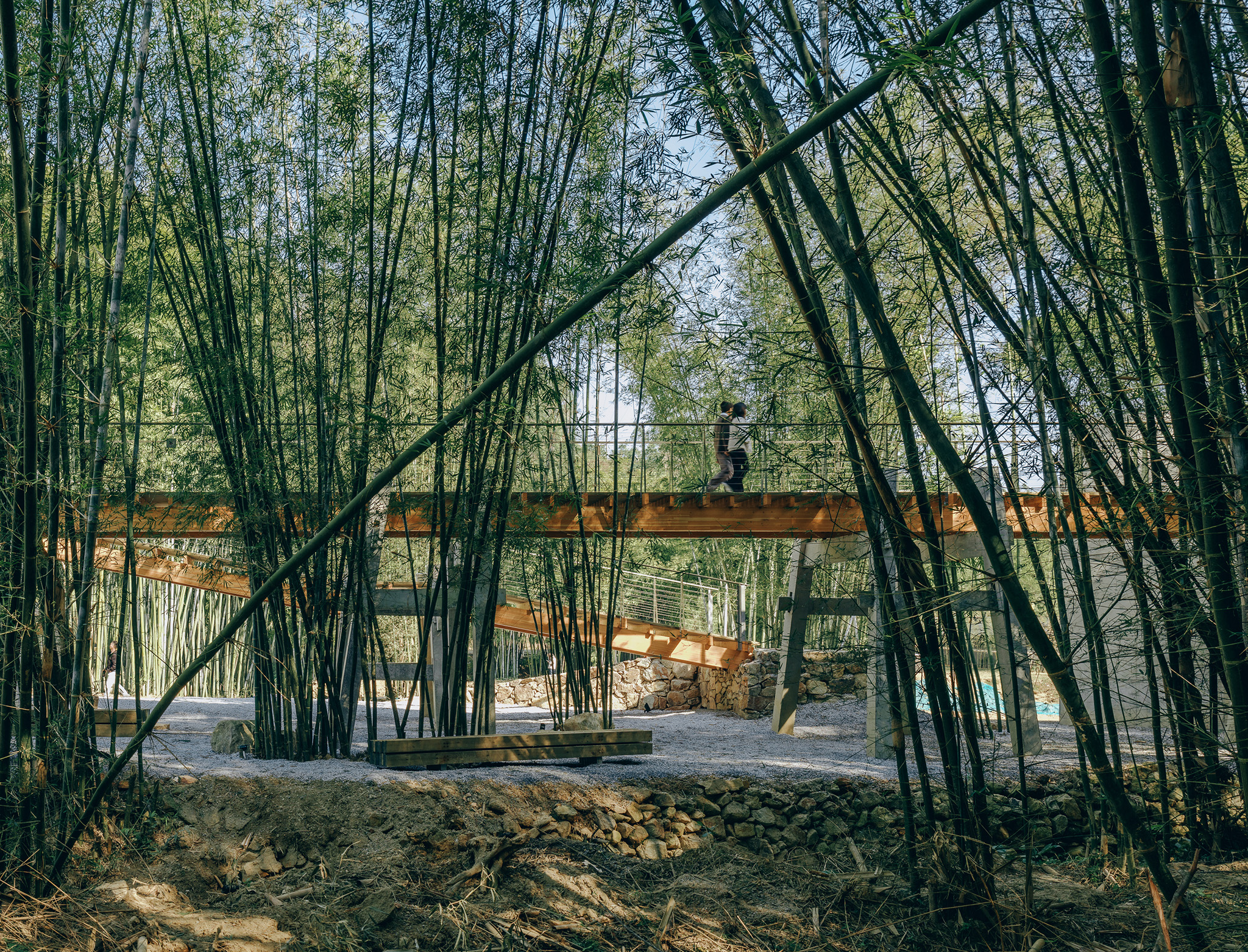 Durante todo el proceso de diseño y construcción del paisaje, procuramos preservar al máximo el bosquecillo de bambú existente. Este enfoque minimalista no solo respeta el contexto del lugar, sino que también se alinea con el marco curatorial «Delicias de Dongpo», en particular con la poética imagen del «bambú junto a la ventana bajo la llovizna», identificada desde el principio como una referencia conceptual clave para el proyecto.