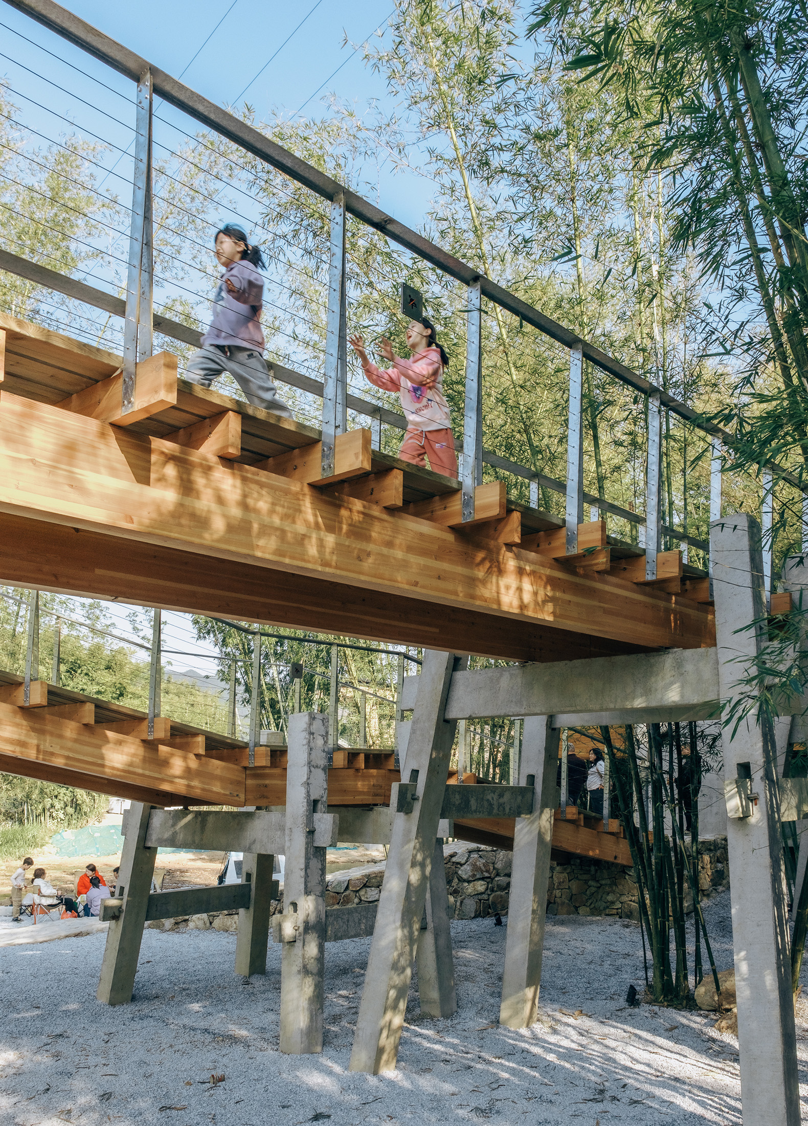 La larga pasarela elevada serpentea suavemente a través del bosquecillo de bambú, emulando la forma espacial lineal que comparten tanto el baqiao («puente de pecho de ganso») como el gaoqiao («puente de patas de banco») locales. Caminar por ella sumerge a los visitantes en un diálogo visual cautivador con el puente histórico cercano. Los tablones de madera se disponen sobre la plataforma de la pasarela con espacios deliberadamente amplios, haciendo referencia al espaciado característico entre las losas de piedra tanto del baqiao como del gaoqiao. Estos espacios no solo facilitan la construcción y el uso cotidiano, sino que también crean un sutil juego de luces, sombras y perspectivas cambiantes.