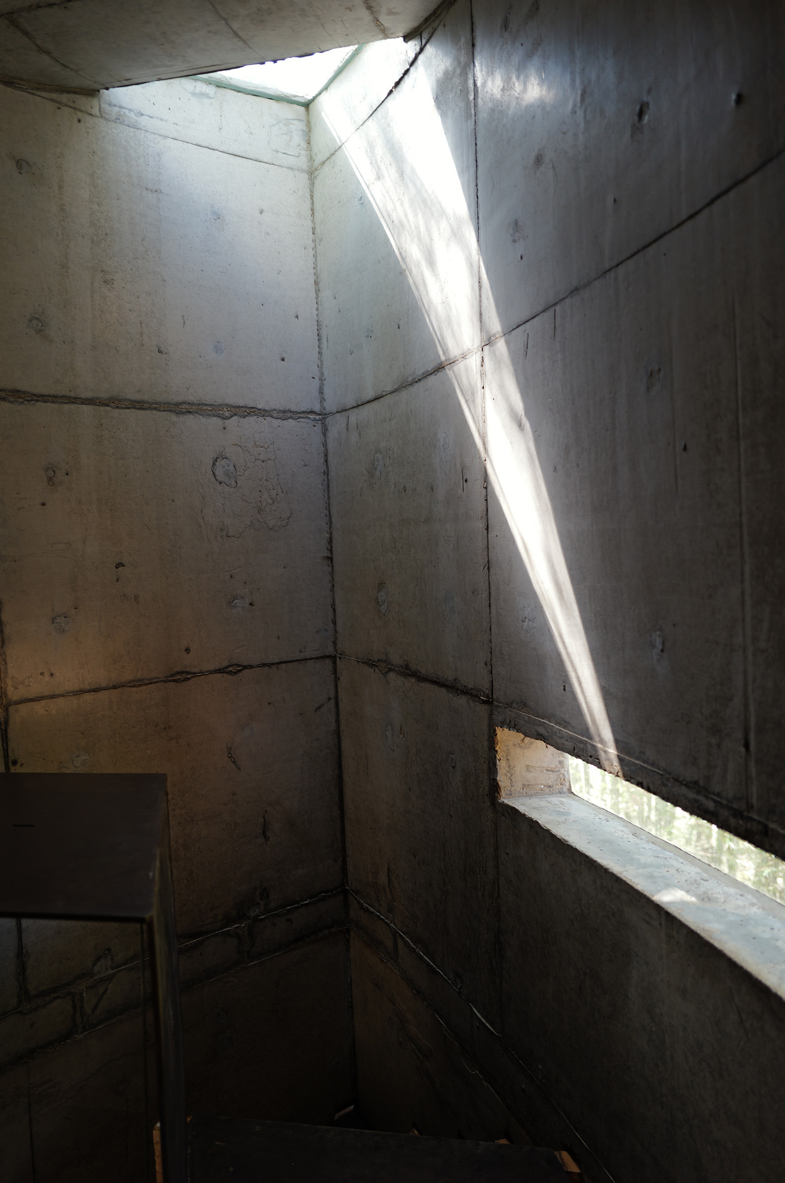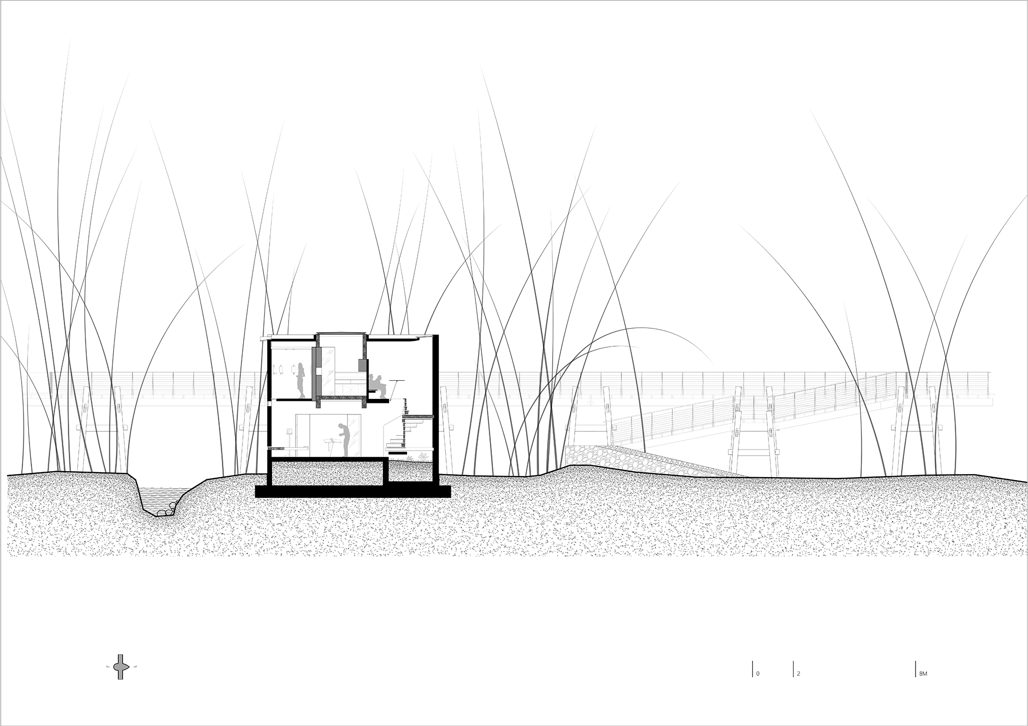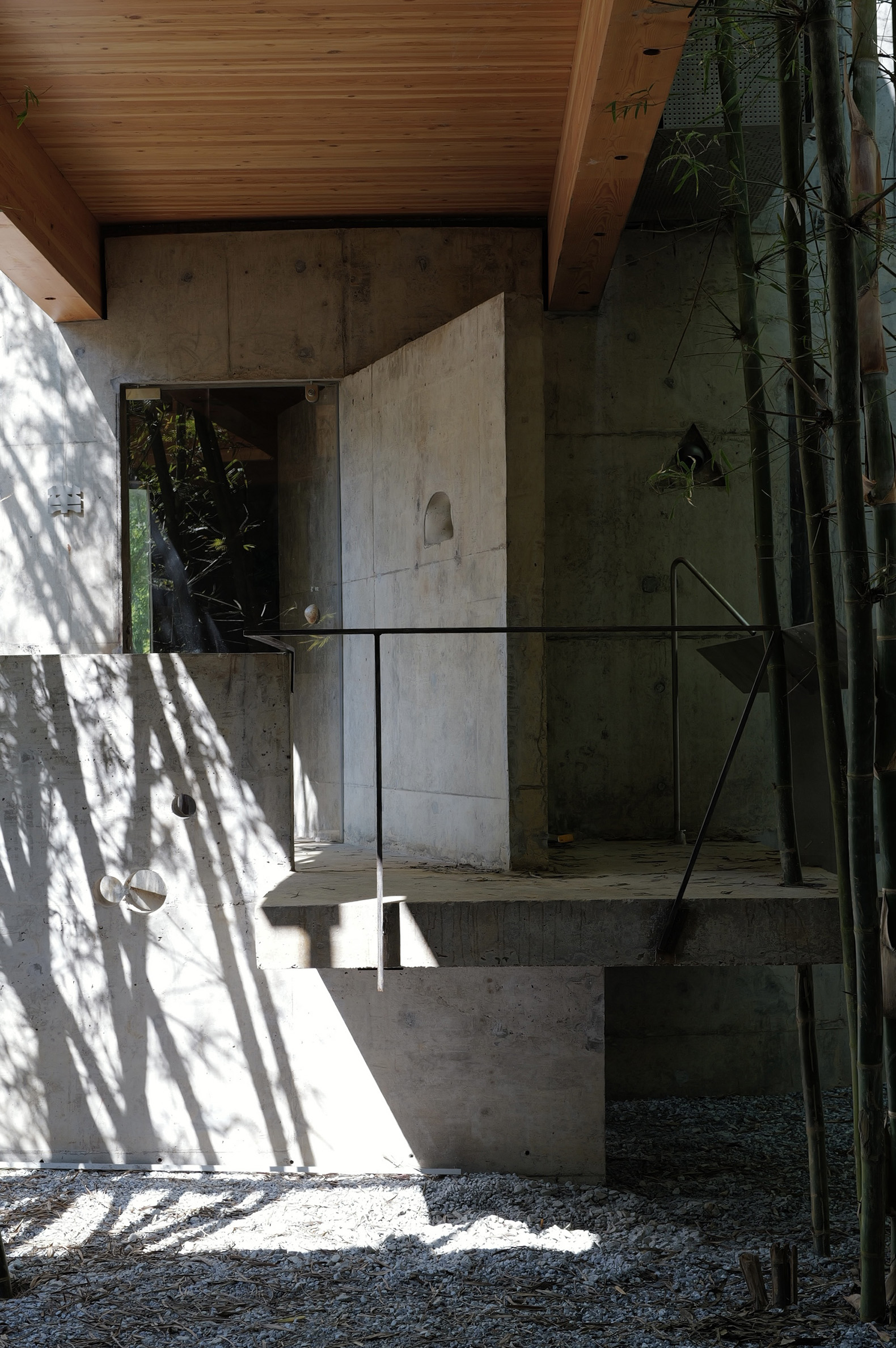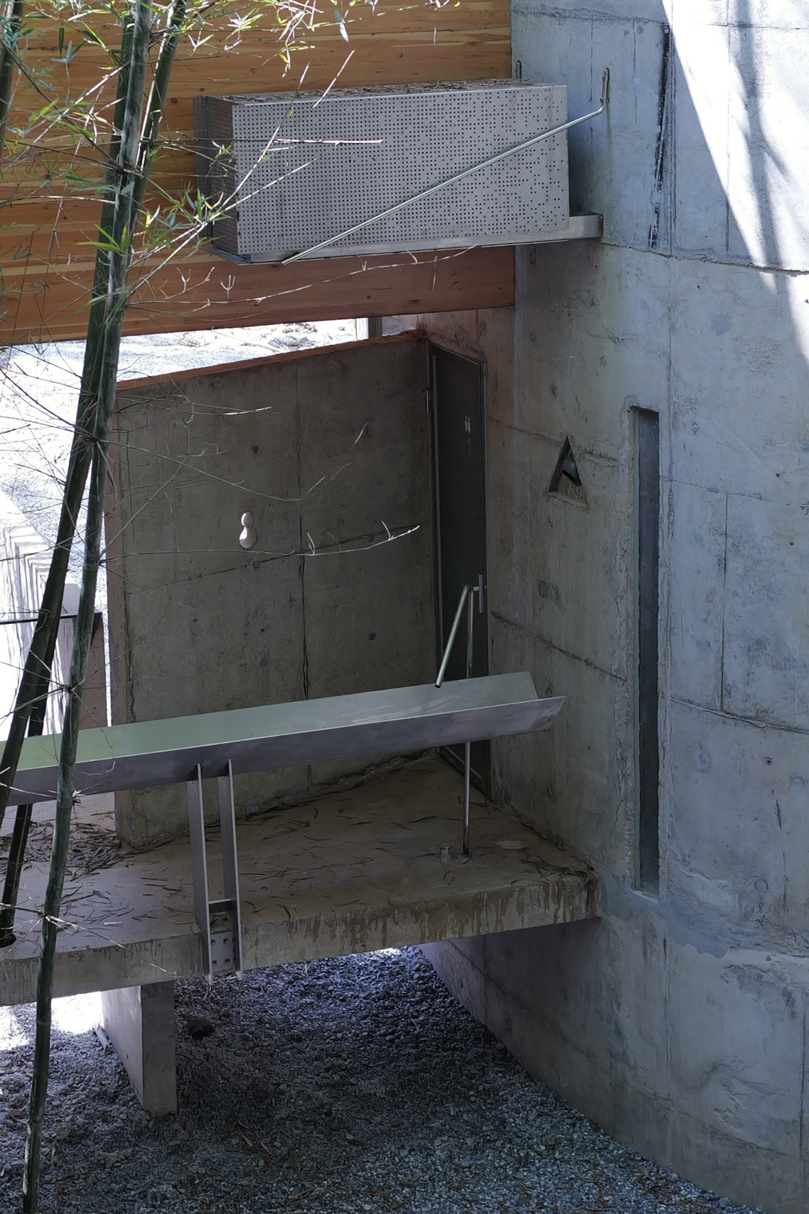Los moldes de acero utilizados para fundir los postes y vigas de hormigón armado de la pasarela elevada se reutilizaron tras la construcción como canales de drenaje exteriores, dirigiendo el agua de los lavabos hacia una suave cascada. Dos vigas de hormigón prefabricado sobrantes se colocaron a lo largo de la orilla y se transformaron en un largo banco, creando un espacio tranquilo para el descanso.