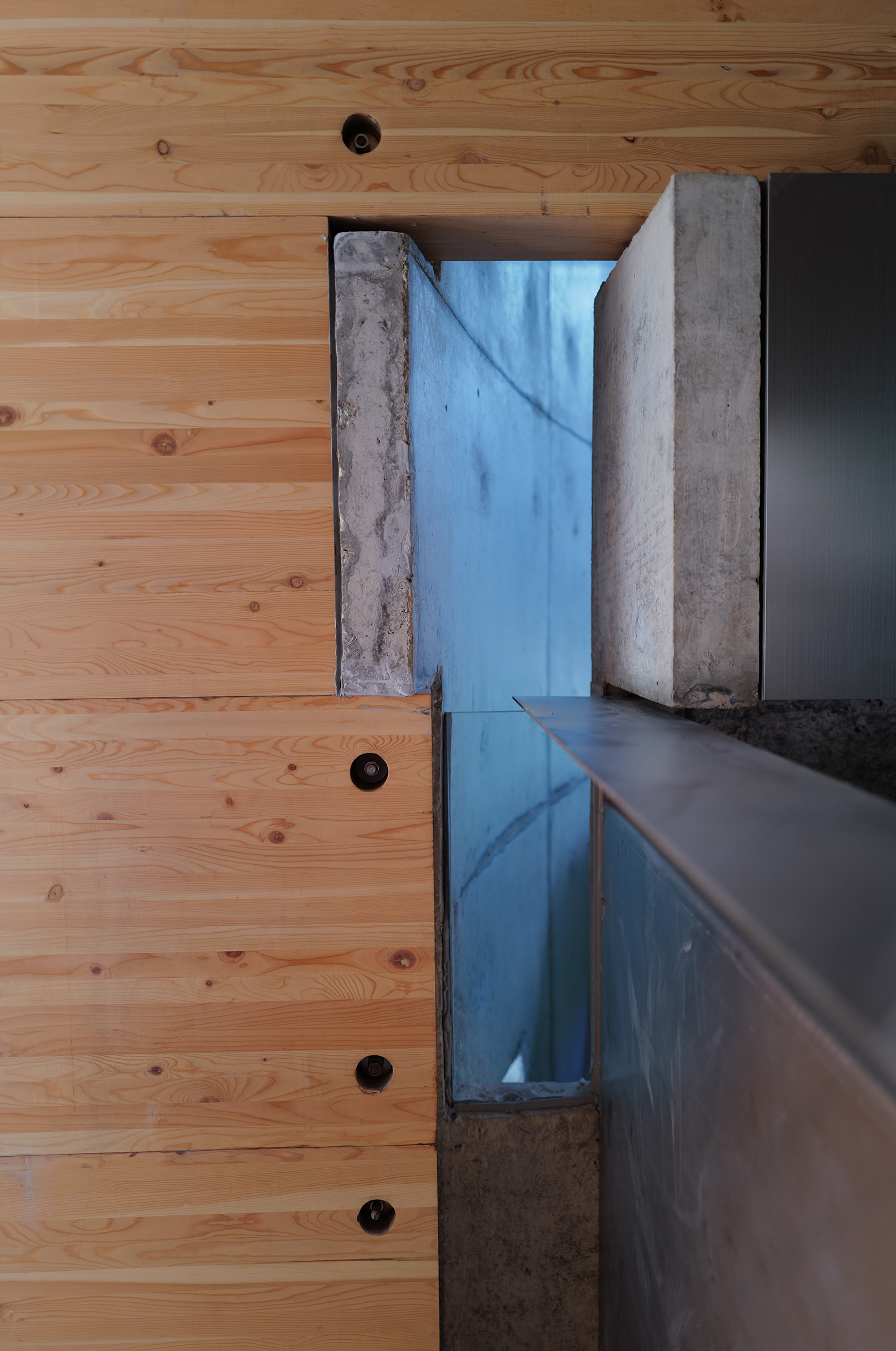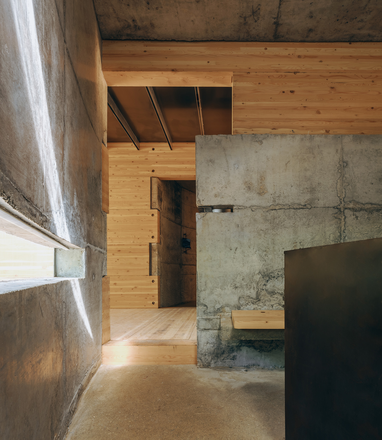 La materialidad y el sistema constructivo se inspiran directamente en las lógicas vernáculas estudiadas. El volumen principal, de hormigón, evoca los pilares del baqiao, mientras que una pasarela elevada reinterpreta la estructura del gaoqiao mediante un sistema de pilares y vigas que remiten a las uniones tradicionales. El uso combinado de hormigón y madera, junto con detalles como aberturas geométricas y reutilización de elementos constructivos, refuerza la conexión con la artesanía local y el proceso constructivo.