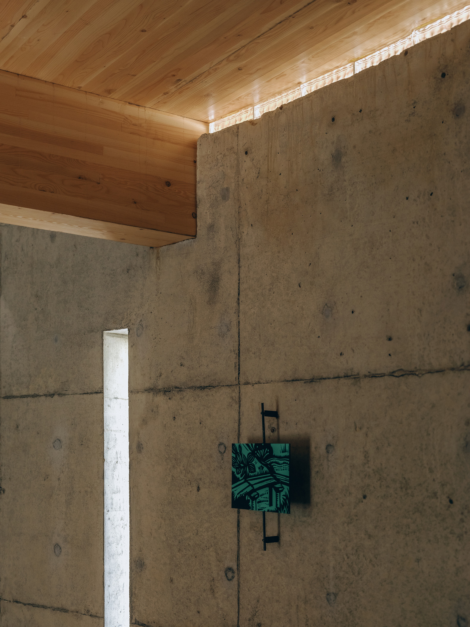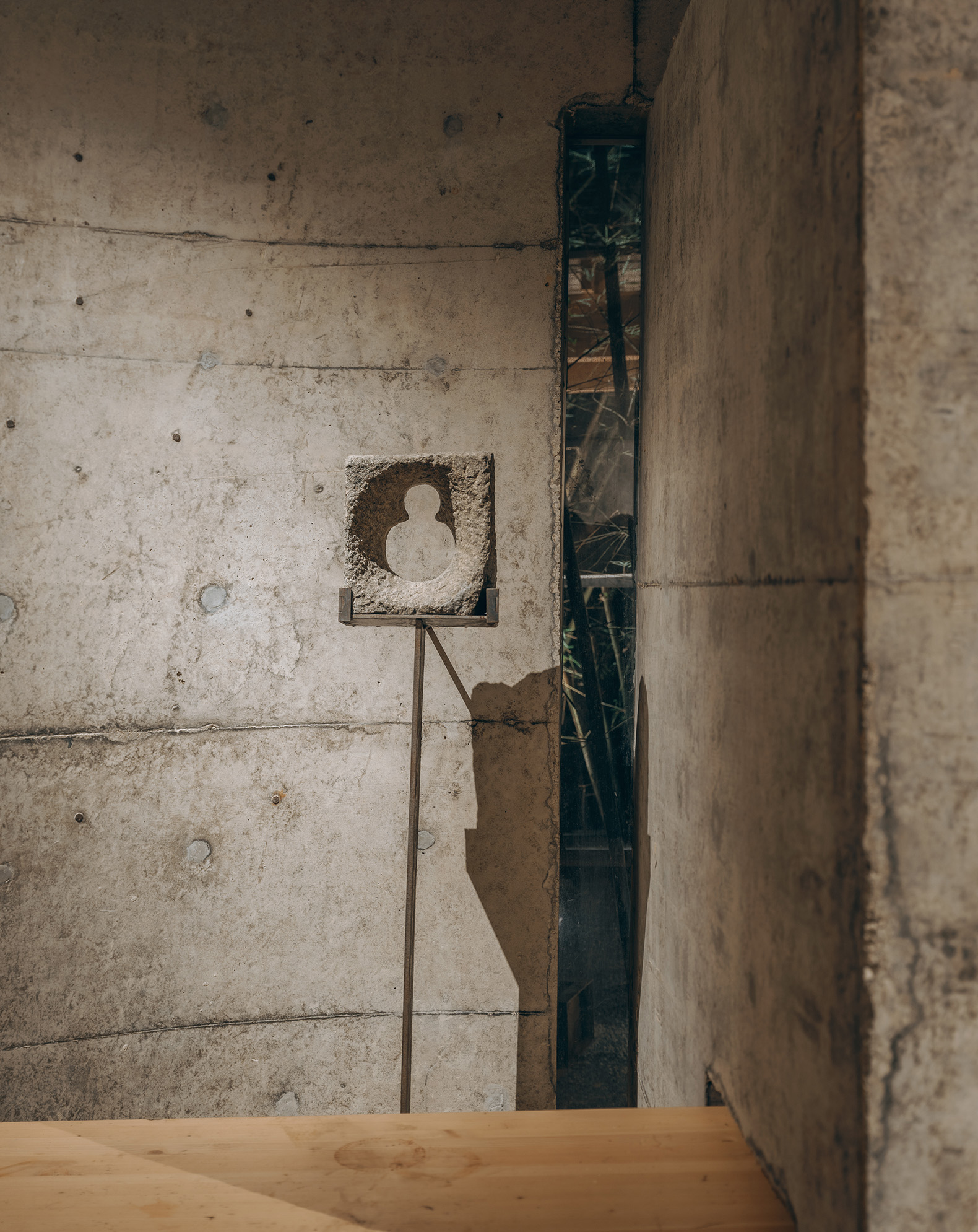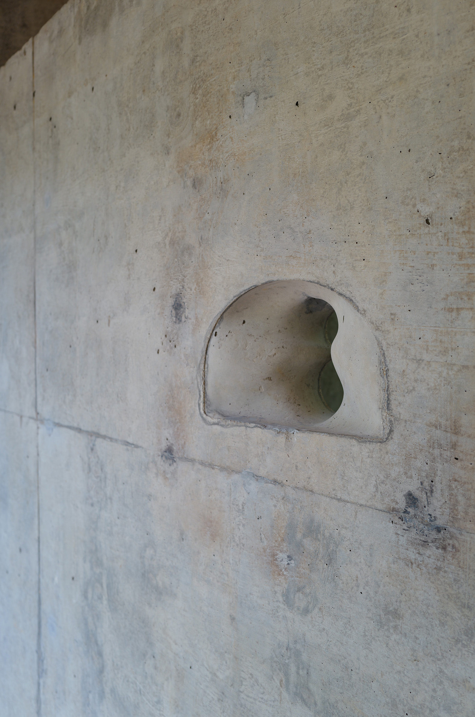 Se han tallado diversas aberturas geométricas en las paredes de hormigón, inspiradas en las aberturas con forma de calabaza, semicirculares y triangulares que se ven comúnmente en las paredes de los recintos Hakka locales. Un bloque de piedra con forma de calabaza, recogido de una casa abandonada durante el trabajo de campo, se exhibe en la galería de la planta baja, como testimonio tangible de la artesanía local y la memoria arquitectónica.