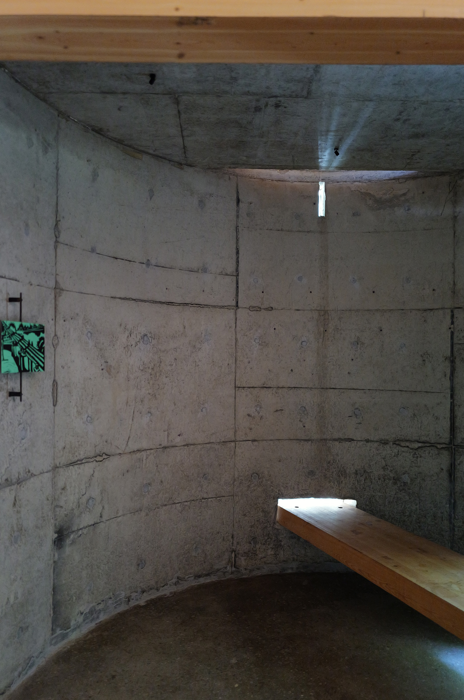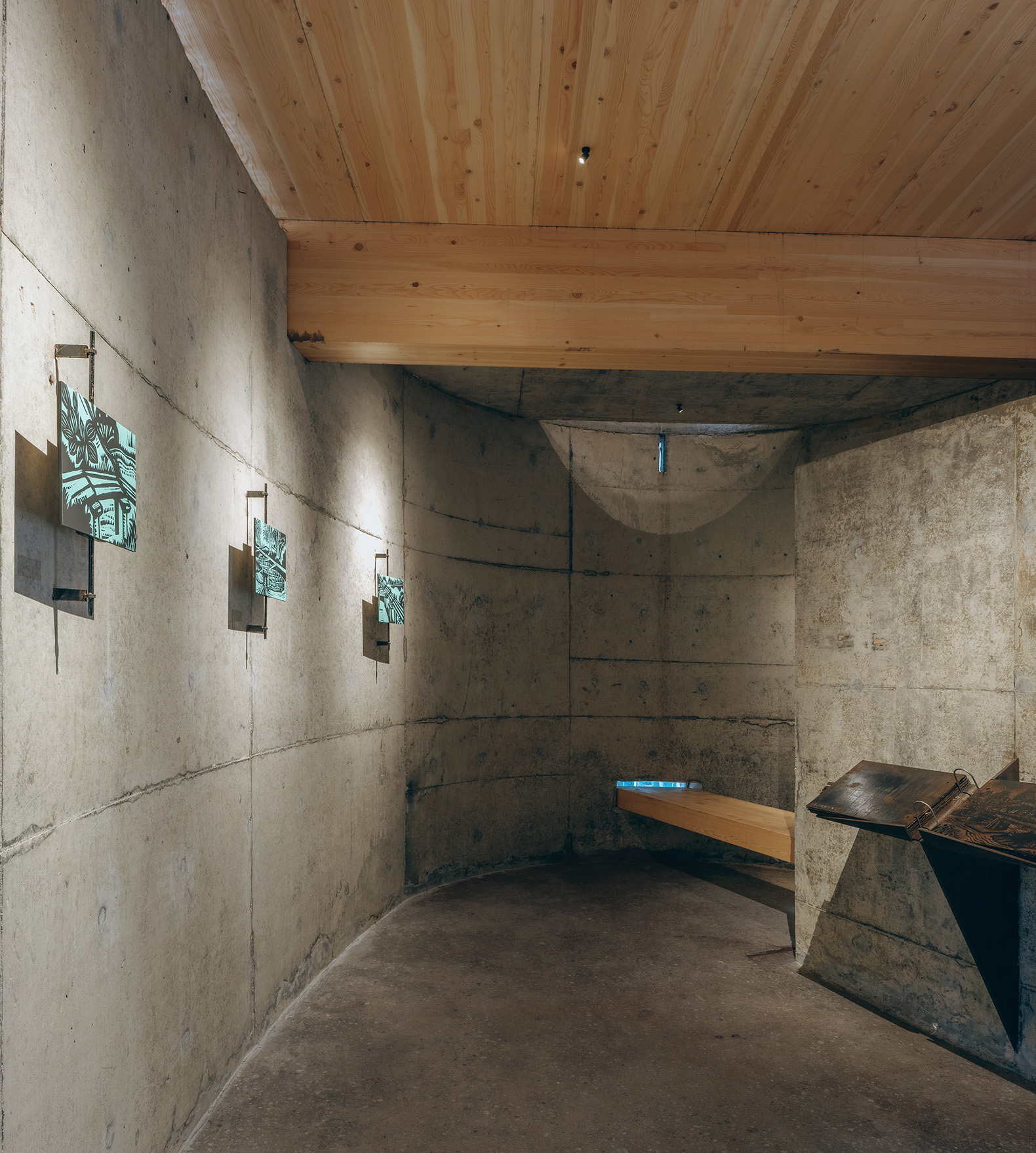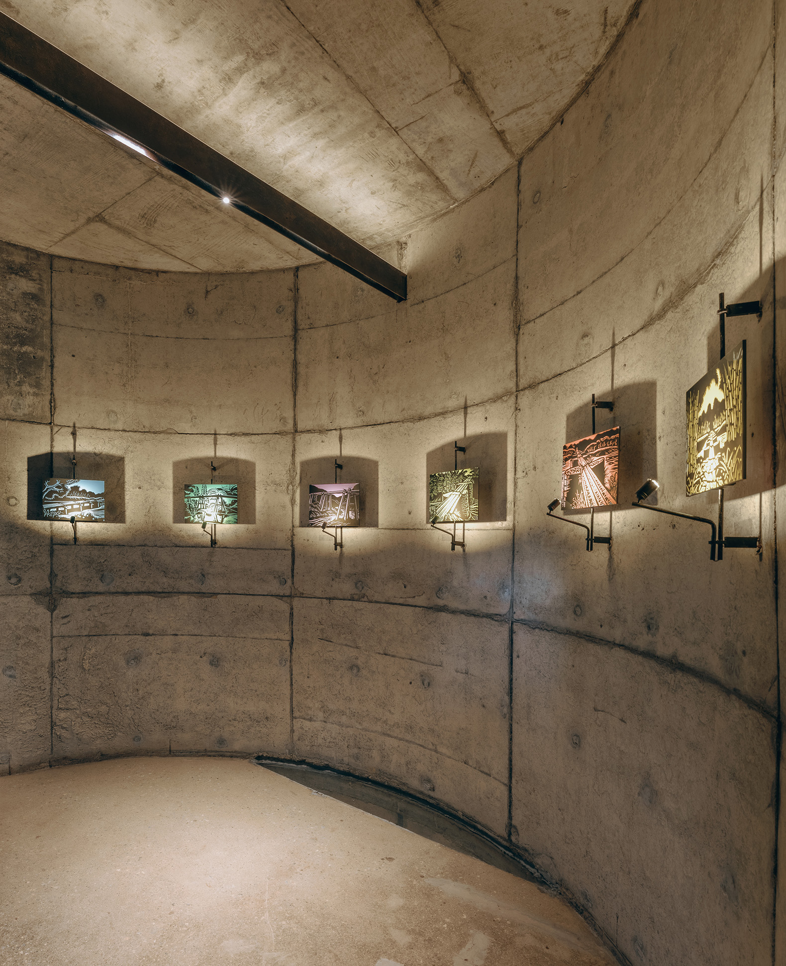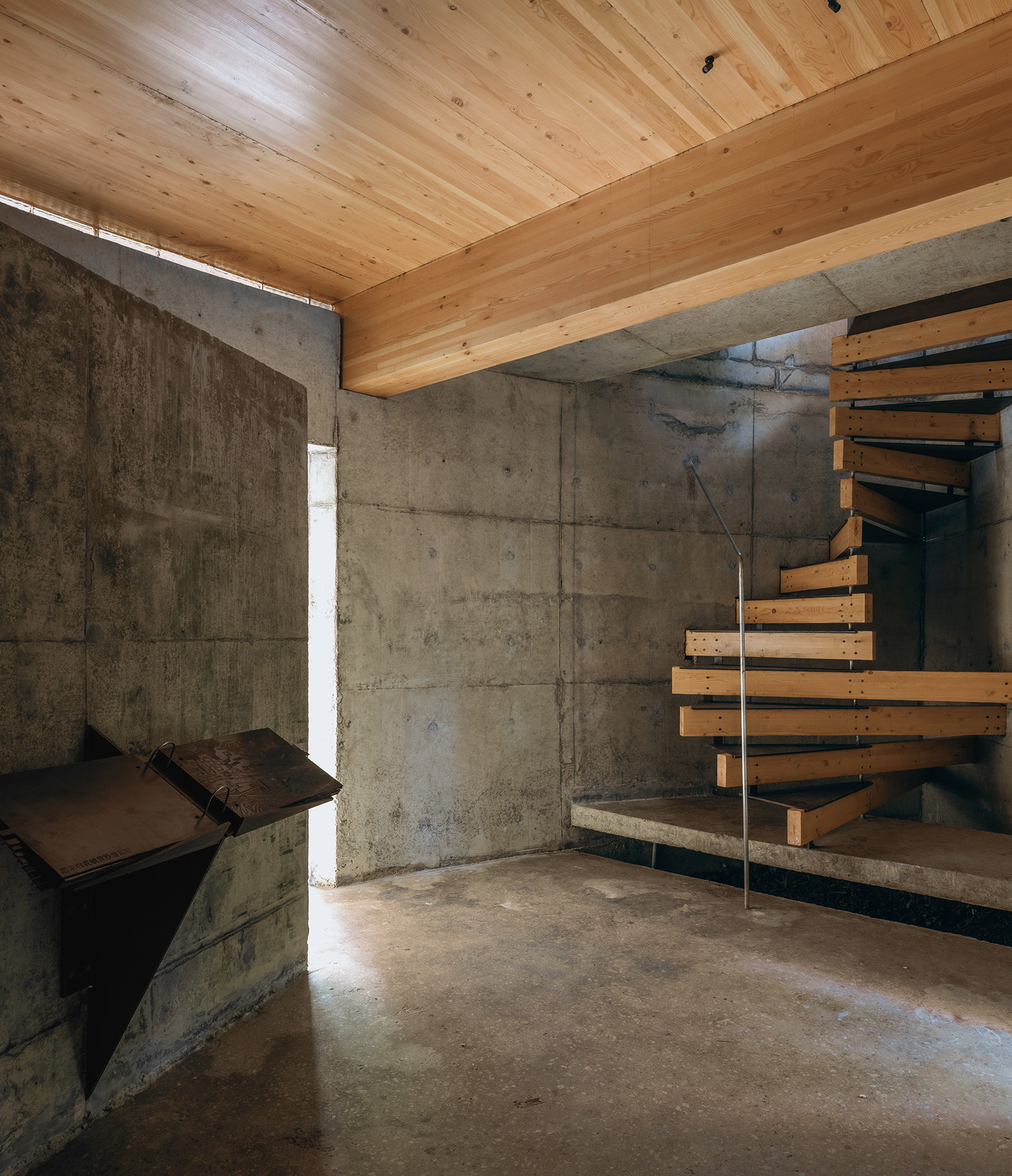 Se han tallado diversas aberturas geométricas en las paredes de hormigón, inspiradas en las aberturas con forma de calabaza, semicirculares y triangulares que se ven comúnmente en las paredes de los recintos Hakka locales. Un bloque de piedra con forma de calabaza, recogido de una casa abandonada durante el trabajo de campo, se exhibe en la galería de la planta baja, como testimonio tangible de la artesanía local y la memoria arquitectónica.