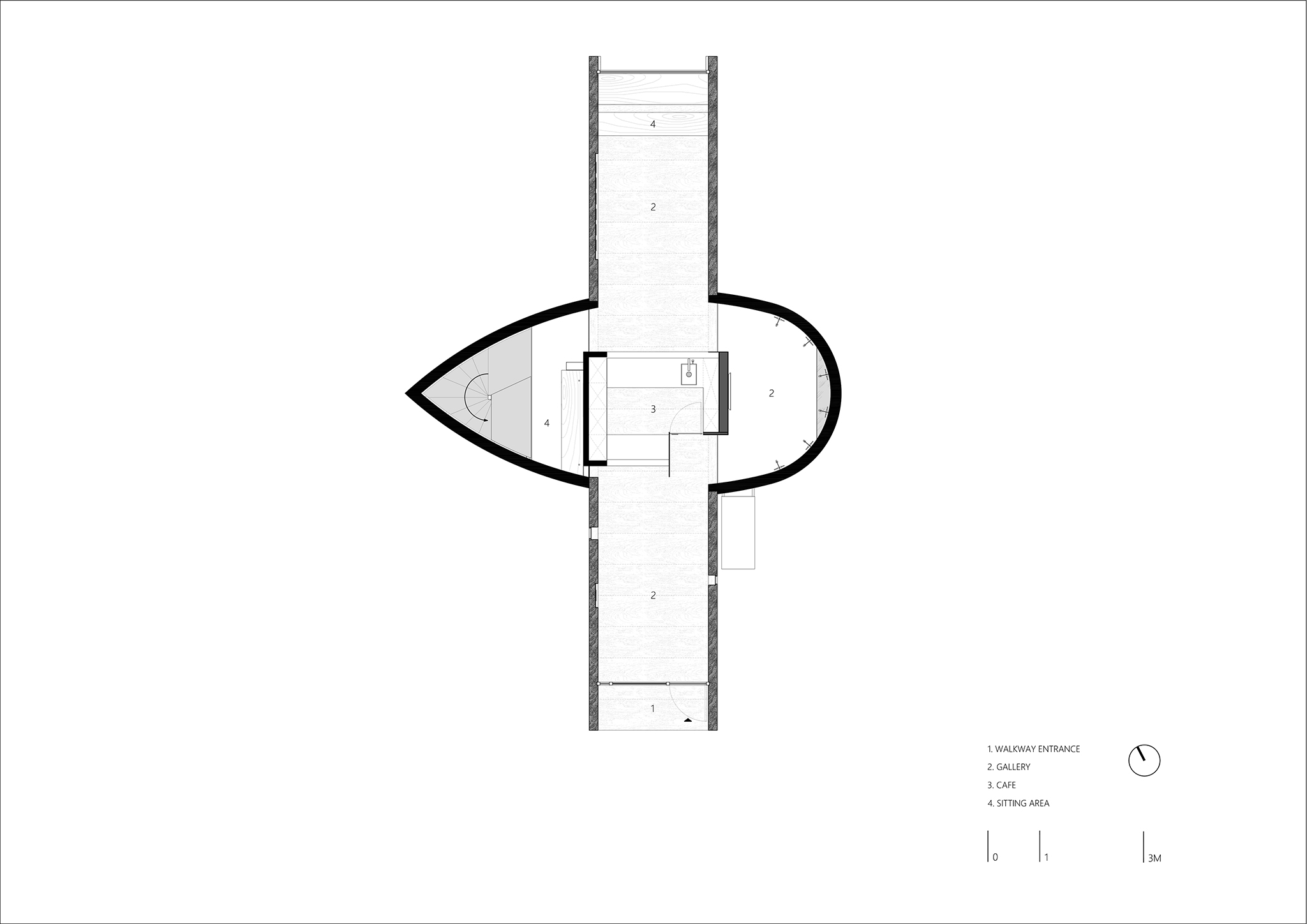 El volumen del edificio se basa en la lógica estructural del baqiao. Inspirándonos en la relación entrelazada entre los pilares y las losas de piedra del puente, creamos un volumen de hormigón en forma de huso que representa el pilar, atravesado por un pasaje con entramado de madera que simboliza el tablero del puente. Al final del pasaje se ubican asientos, ofreciendo el mejor punto de vista para una vista panorámica del cercano puente Shisanba. El volumen de hormigón en forma de huso consta de dos niveles. El nivel inferior alberga un aseo y lavabos —para los visitantes que no puedan acceder a la galería—, así como la entrada y parte del espacio de exposición, conectado al nivel superior mediante una escalera interior. El segundo piso alberga la galería principal y una cafetería que ofrece bebidas y refrigerios ligeros, con acceso directo a la pasarela elevada al aire libre.
