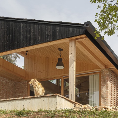 La estructura de madera se consigue enfatizar gracias a las fachadas cerámicas que solo llegan hasta la altura del dintel de las ventanas que ayudan a generar un carácter pétreo y más íntimo. En la parte del porche se genera un «sombrero» a modo de cubierta y fachada que llega desde el interior hacia el exterior.