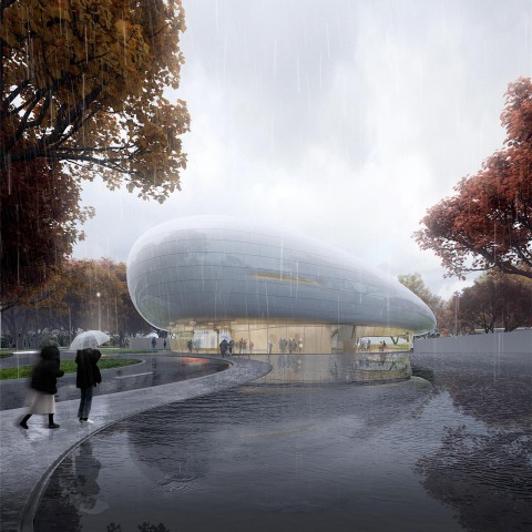 El edificio propuesto por MAD está situado cerca de la pintoresca costa de Beidaihe en el noreste de China. Desde la distancia, parece que el edificio es una «nube flotando en el bosque». El exterior de vidrieras blancas pulidas de la estructura refleja la luz del sol, el cielo y el paisaje, cambiando la luz y el color con respecto a su entorno. En su entrada, los visitantes se encuentran con un estanque reflectante en medio del exuberante paisaje.