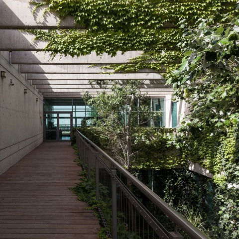 El centro tiene dos entradas separadas, cada una en un nivel diferente y con fachadas opuestas que dividen el edificio en dos pisos completamente separados ocupados por diferentes empresas. Un patio central conecta los dos pisos ofreciendo un jardín escondido como el corazón del proyecto. A pesar del presupuesto extremadamente bajo ($ 700 por metro cuadrado), el diseño cuidadoso evita comprometer las cualidades arquitectónicas.