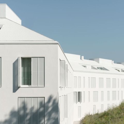 La edificación se conforma volumétricamente recogiendo los elementos configuradores del solar: un elemento lineal, borde y límite, materializado como un volumen continuo en cuya envolvente se reconocen distintas texturas: una chapa perforada vinculada a los huecos, que sirve de transición entre exterior e interior y otra maciza, con revestimiento continuo blanco. Todo ello se culmina con una cubierta inclinada que refuerza la imagen tipológica del conjunto y que se materializa en concordancia al revestimiento metálico de los huecos de fachada.