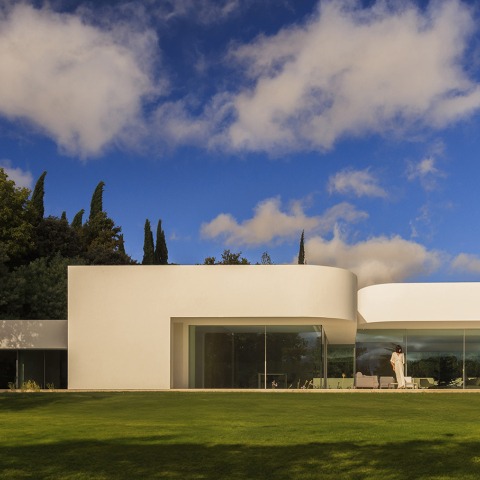 El proyecto cuenta con vistas diagonales hacia un lago perteneciente al campo de golf de La Moraleja en Madrid, dado que la dimensión de esta ubicación lo permitía, se propone una vivienda que se desarrolla principalmente en una sola planta. La zona de día se organiza en dos volúmenes de diferentes alturas que se desplazan entre sí para crear una terraza protegida que mira al paisaje, orientada hacia el sureste. El cuerpo principal tiene la altura de casi planta y media. Una tercera pieza alberga la zona de noche, ubicada de tal manera que dispone de su propio espacio exterior con más intimidad.